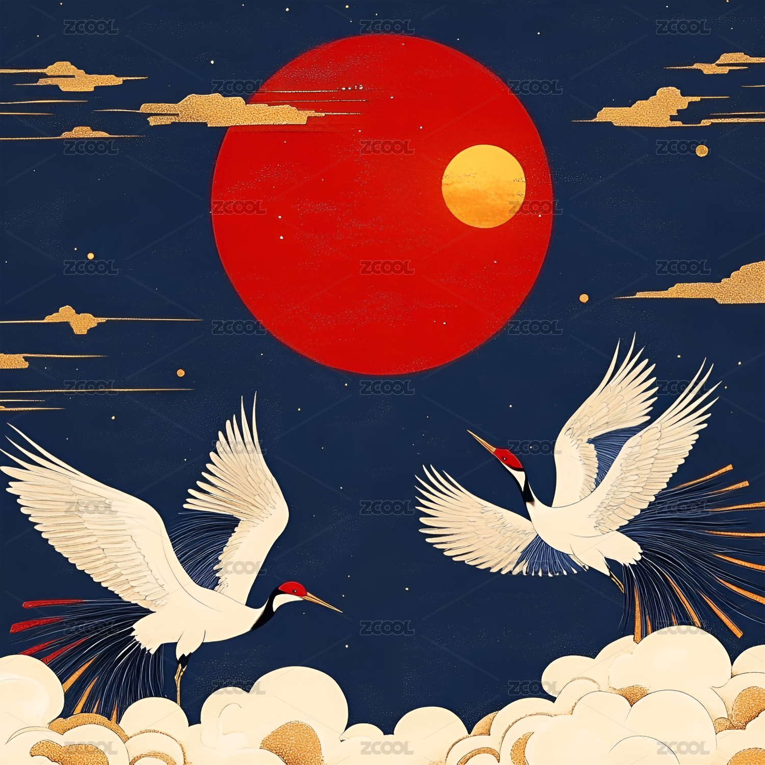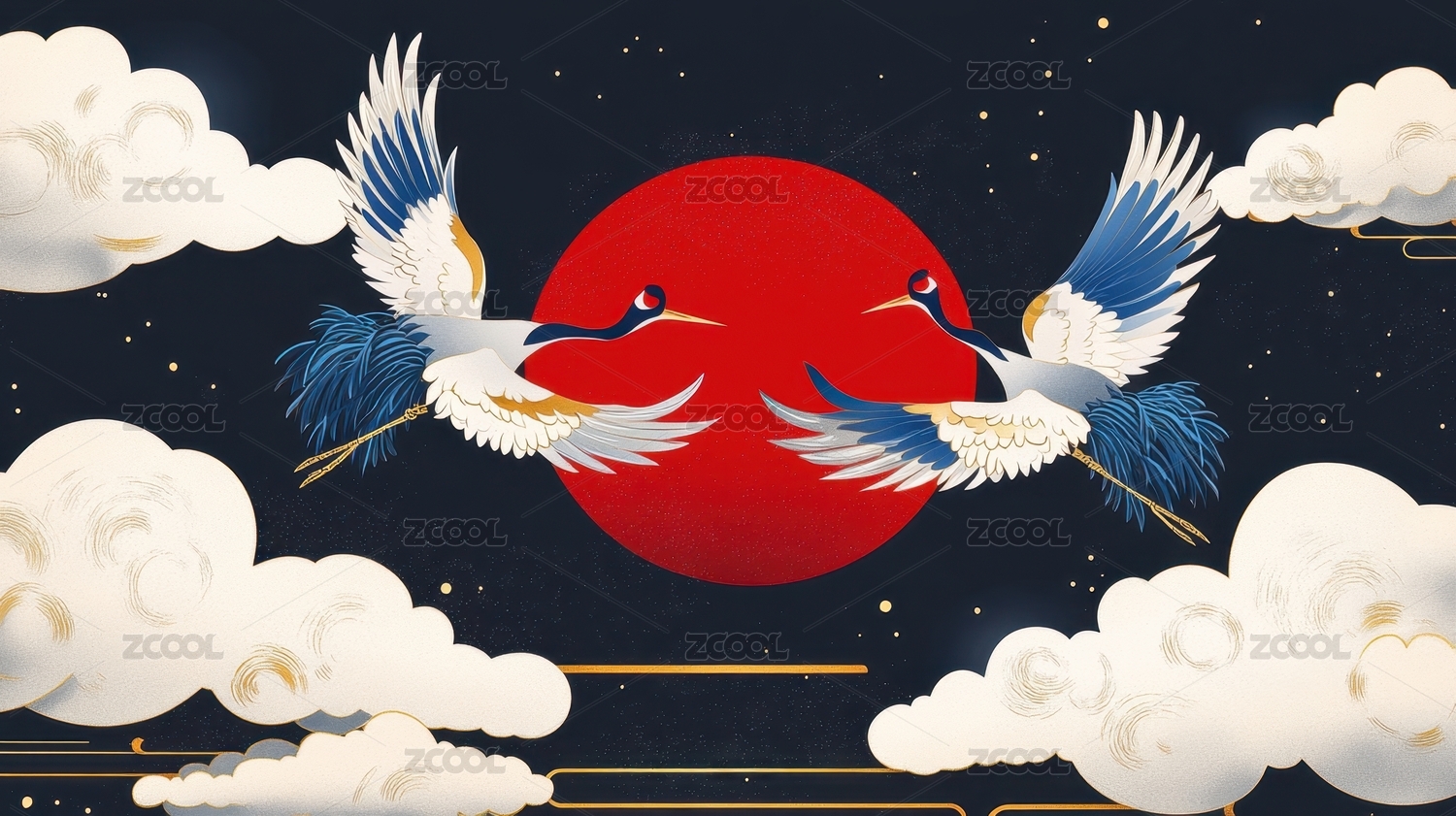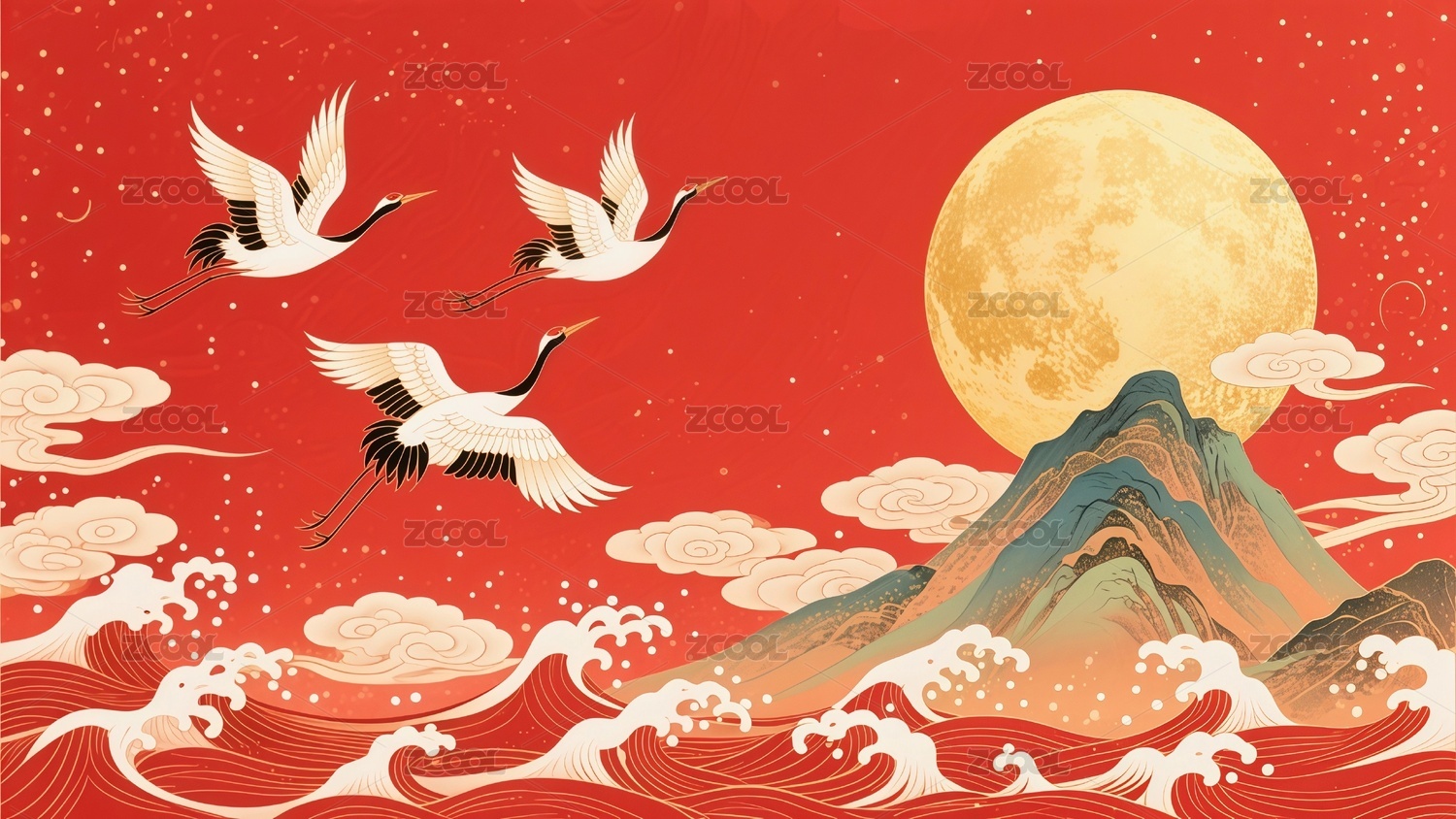 仙鹤,红日,祥云,山水,插画,传统,东方,艺术,装饰,古典