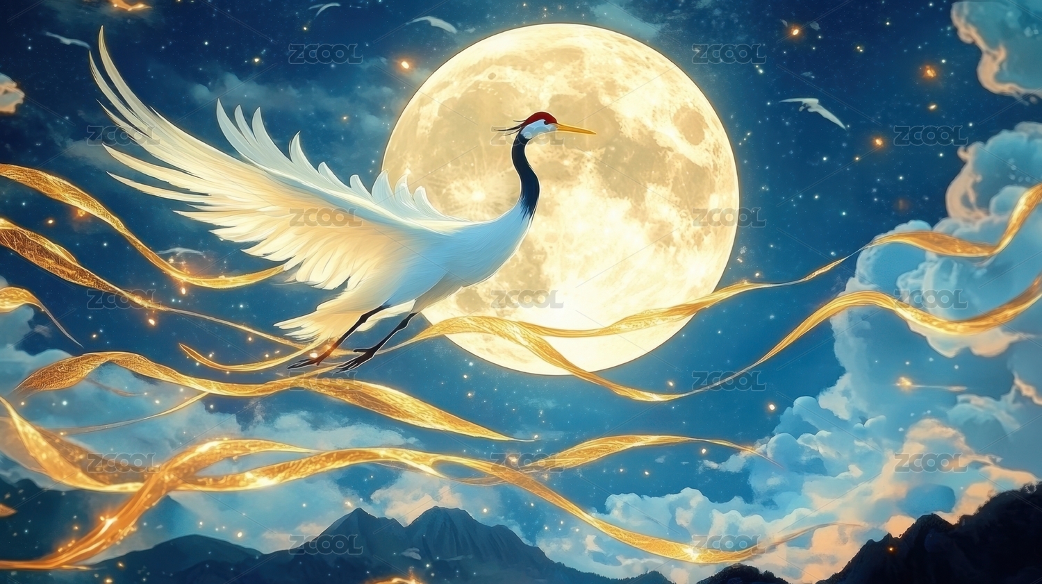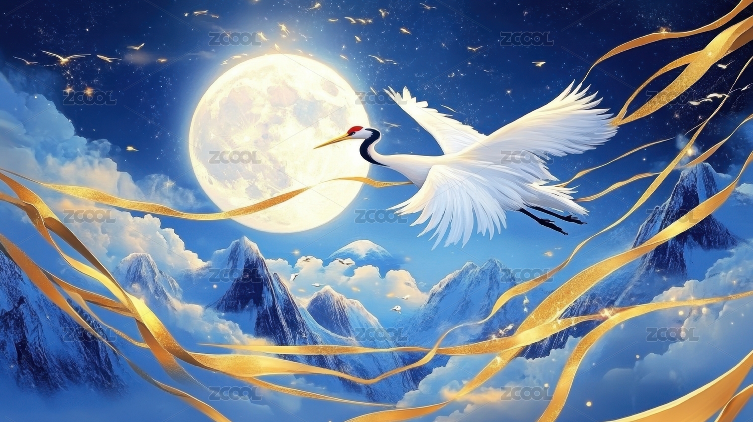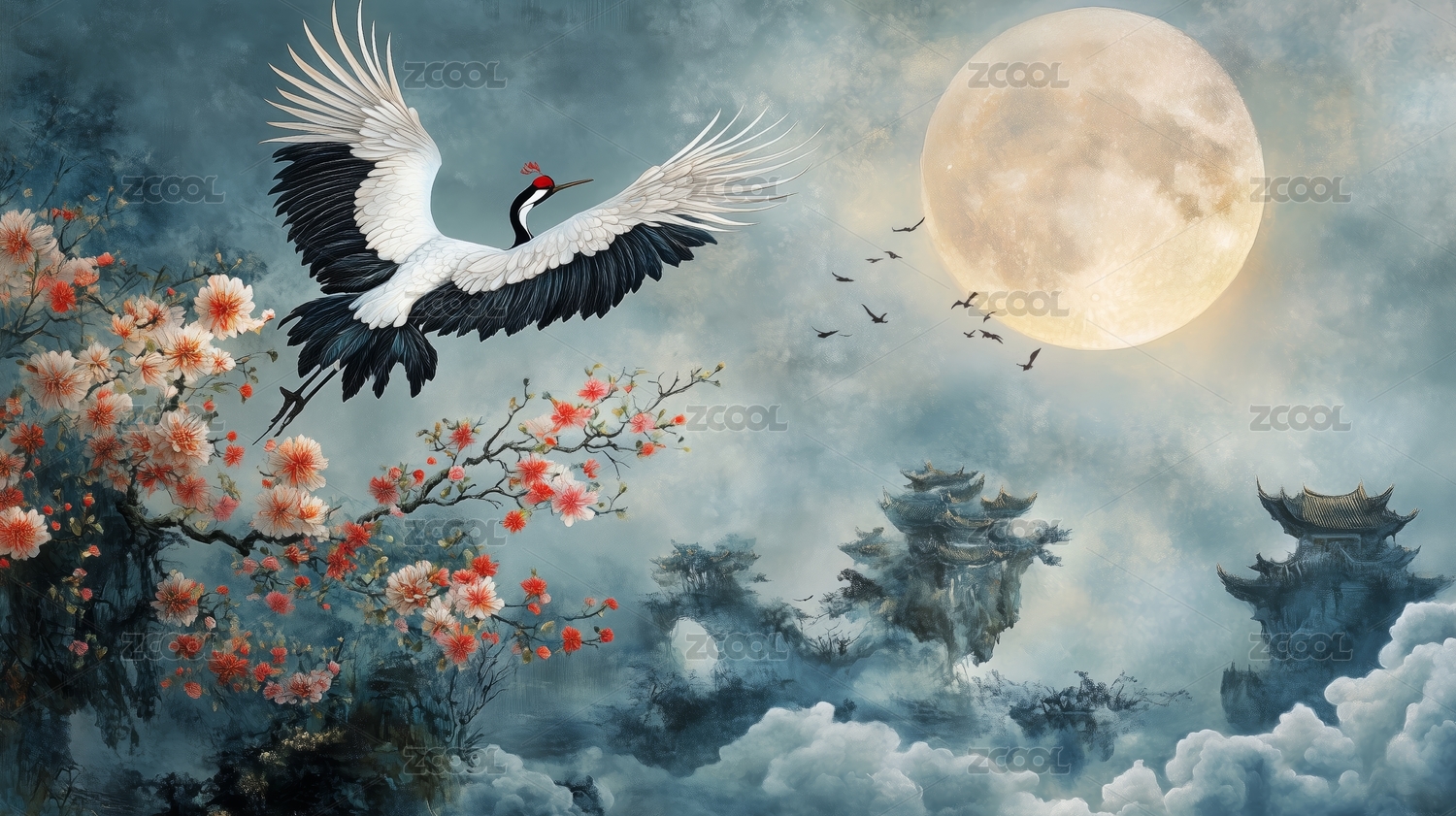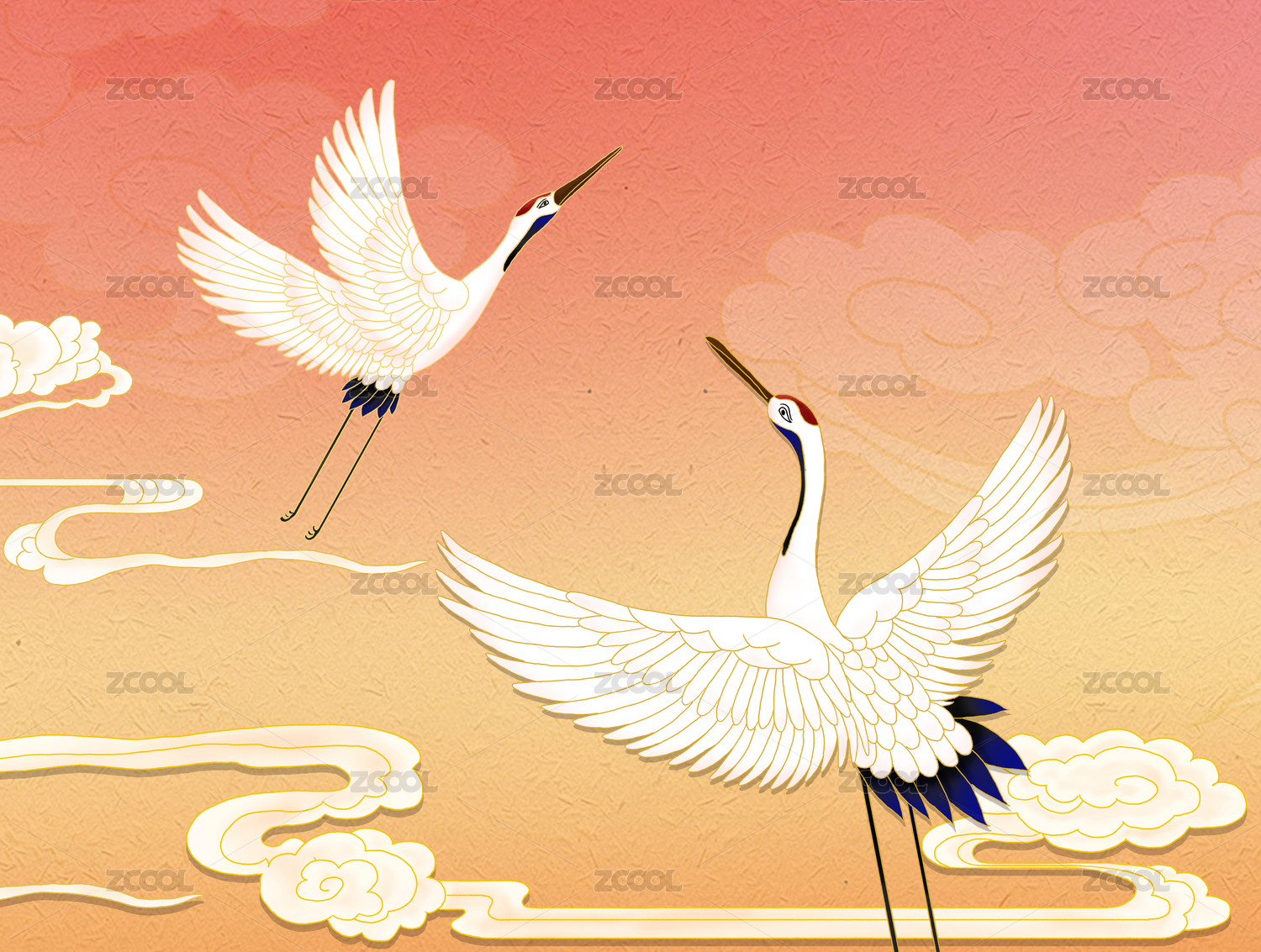 仙鹤,红日,祥云,山水,插画,传统,东方,艺术,装饰,古典