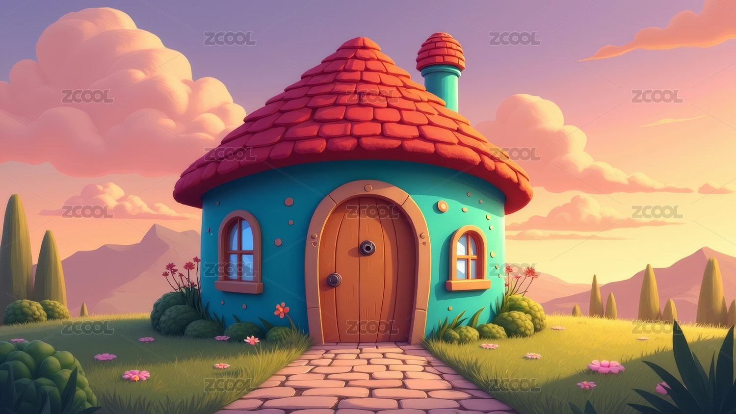 房屋,山崖,粉色,卡通,插画,矢量,童话,风景,山水,城堡