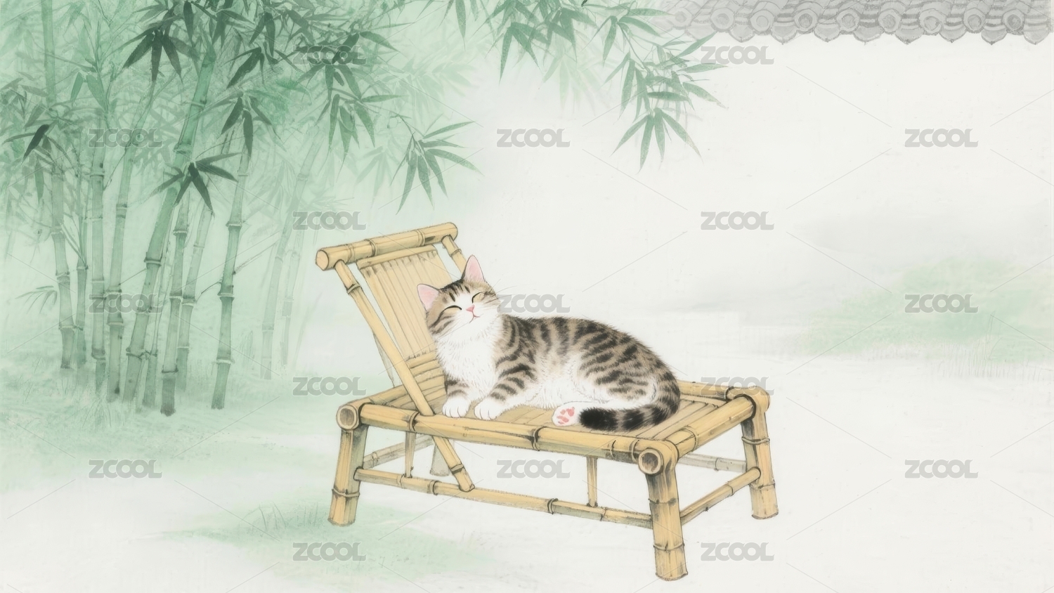 竹林屋檐下猫咪静卧