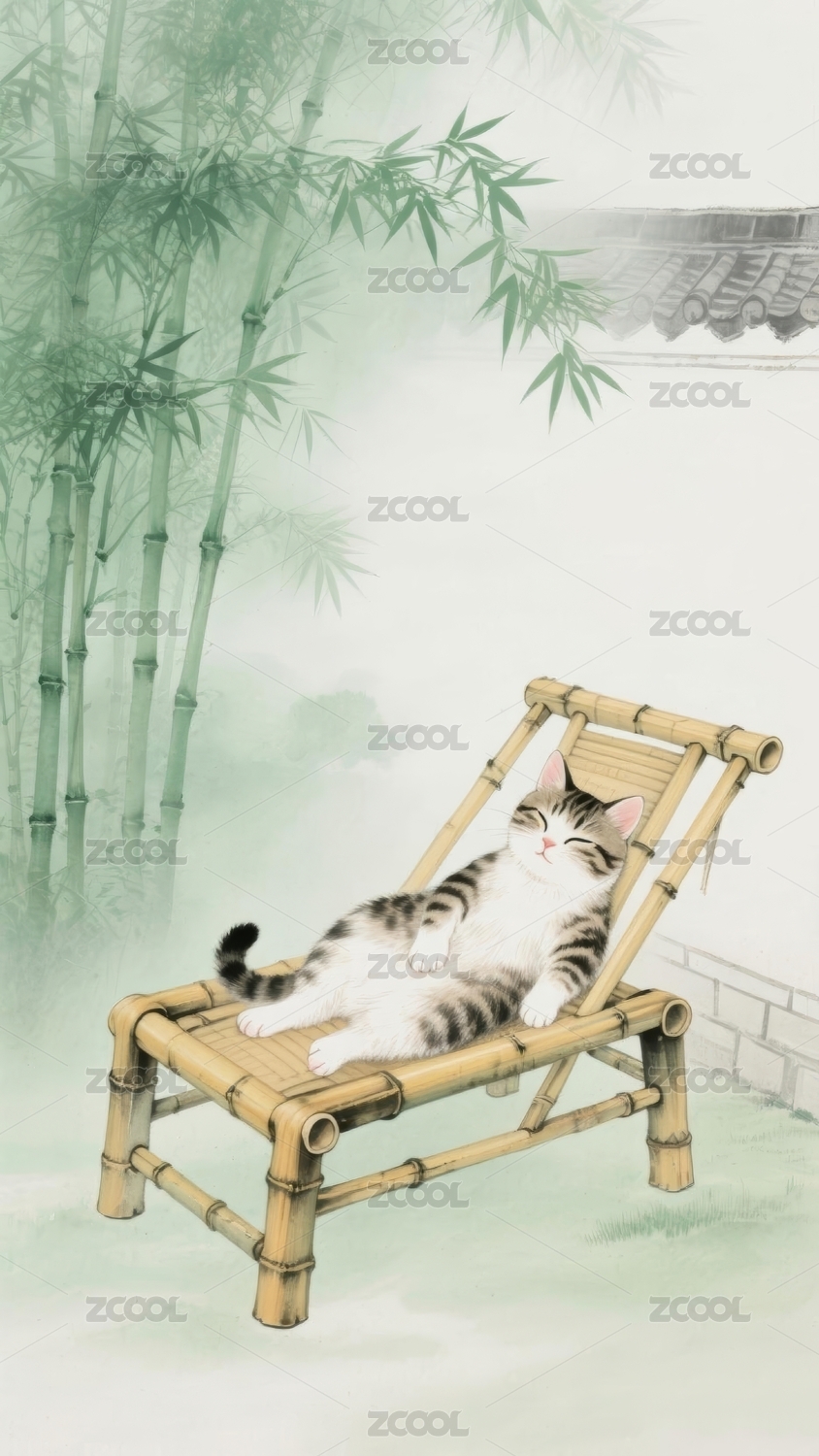猫咪闲适感竹林休憩场景