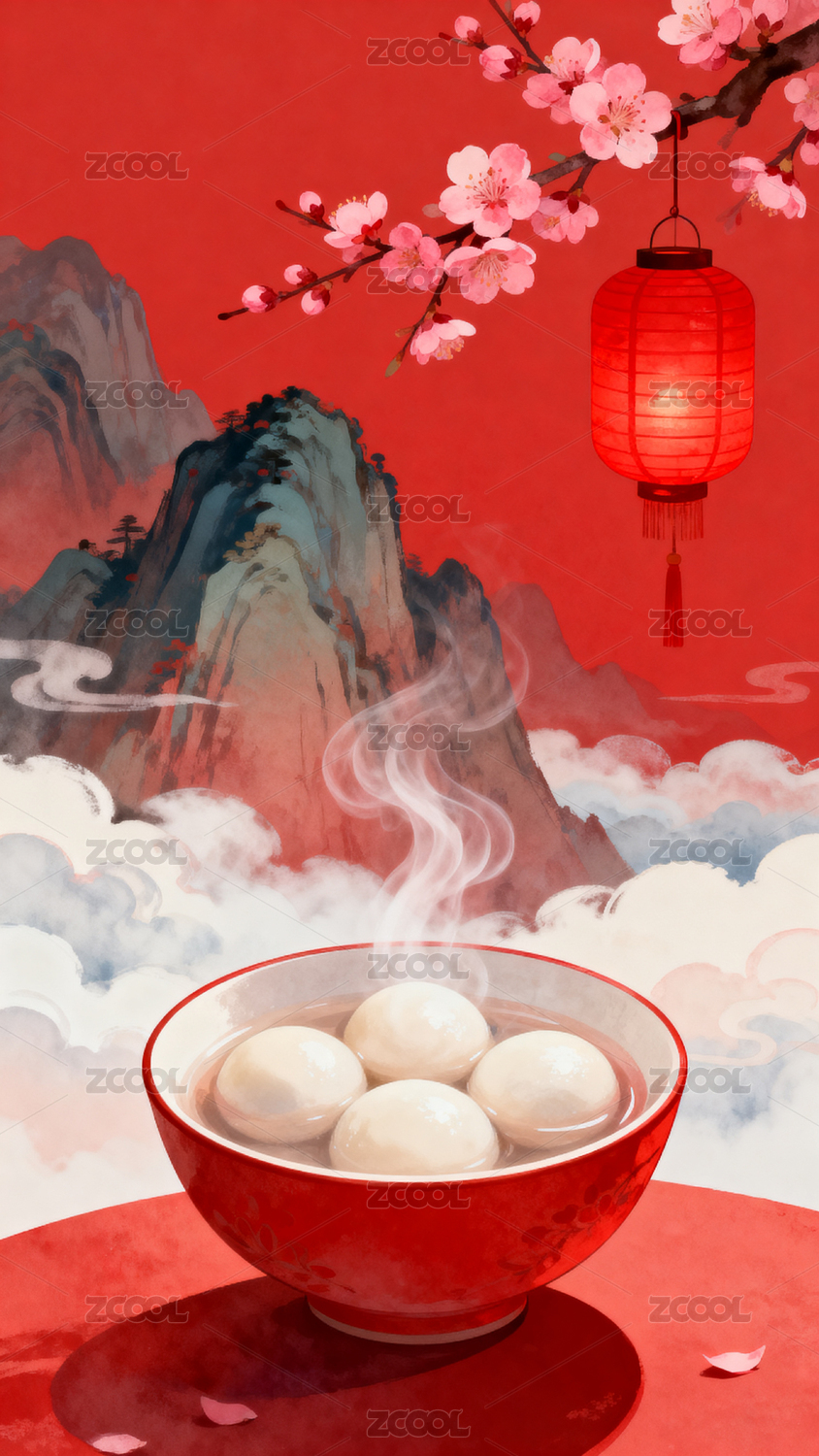 红色,背景,节日,汤圆,碗,热气,蒸汽,元宵,灯笼,云