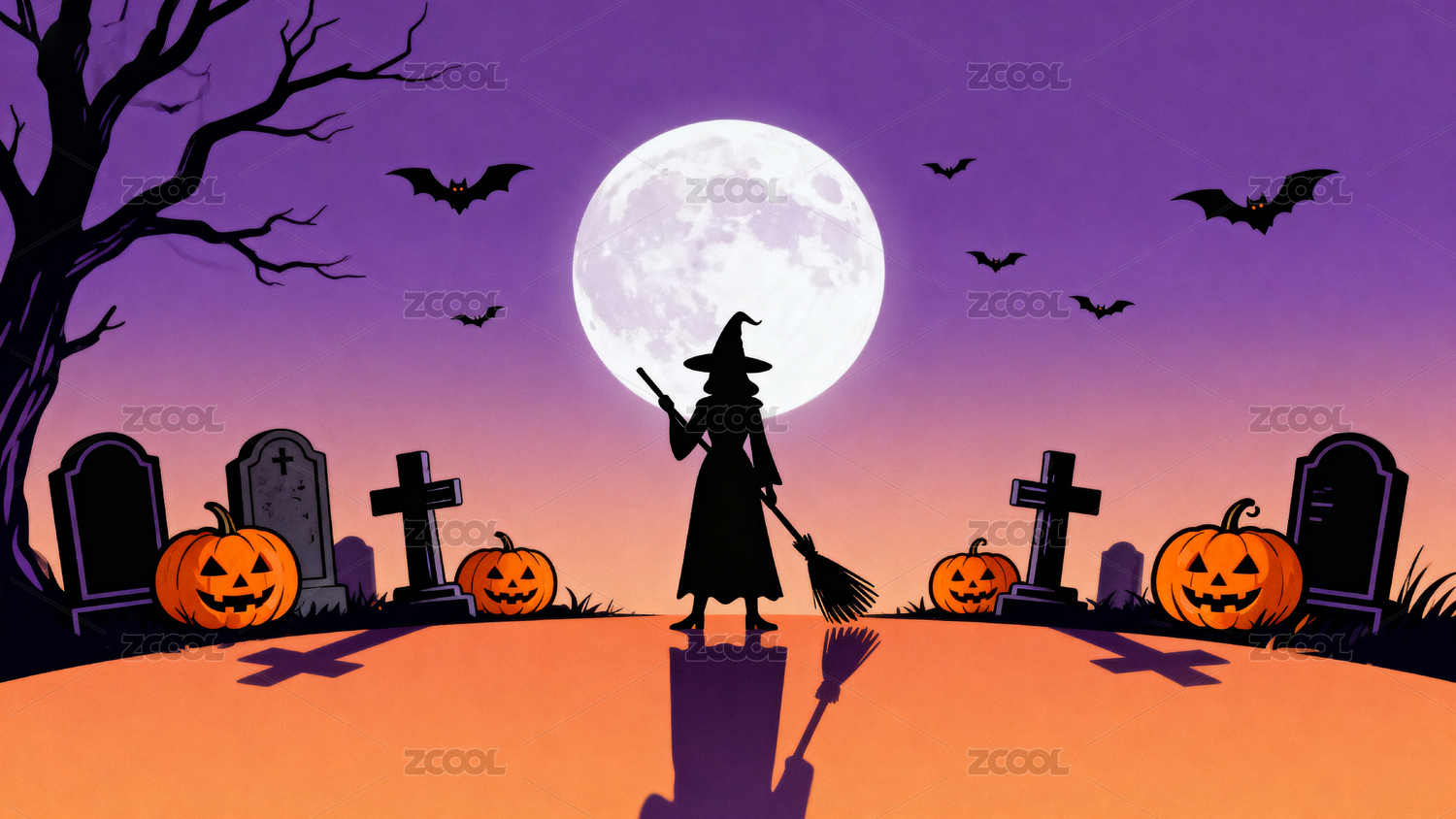 万圣节横版巫女南瓜鬼怪出行插画海报