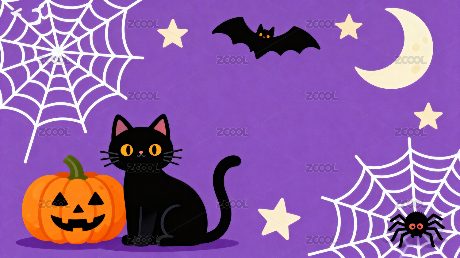 蝙蝠,蜘蛛,星星,紫色,万圣节,蜘蛛网,动物,南瓜,黑猫,夜晚
