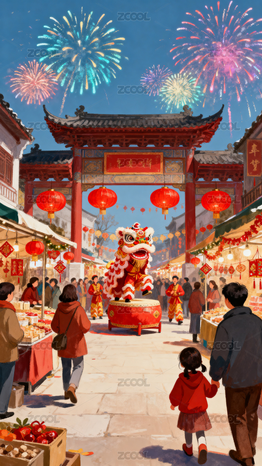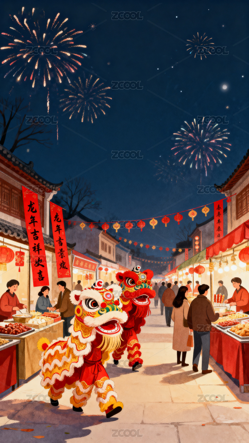 春节舞狮烟花夜市