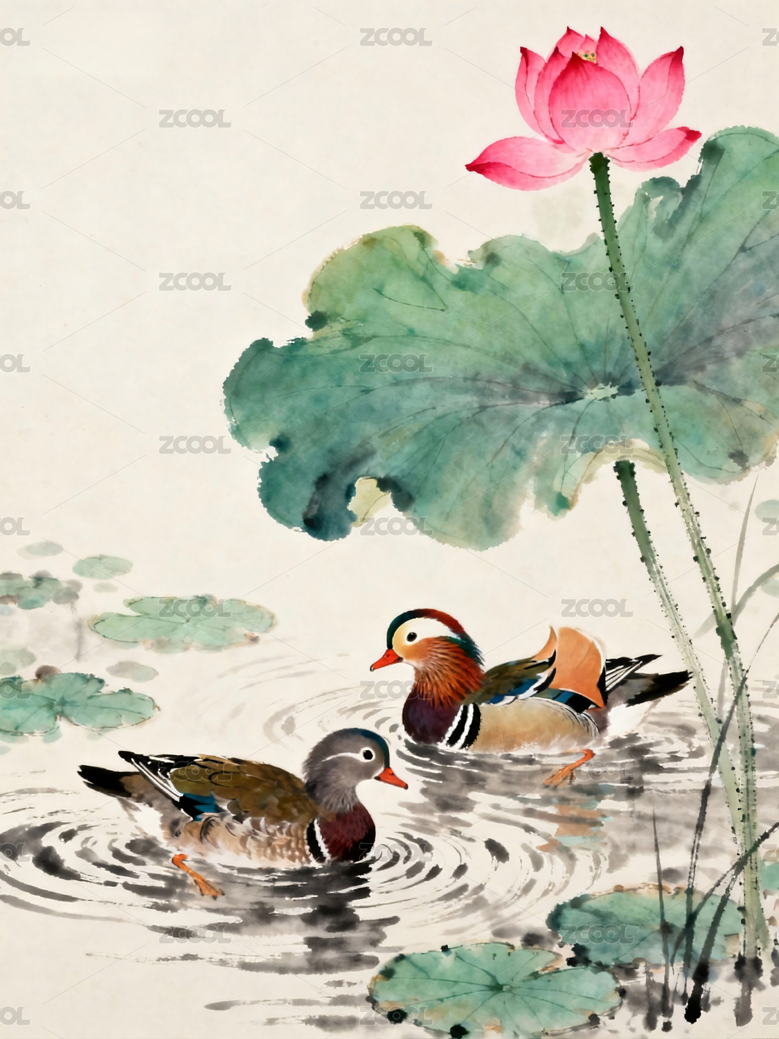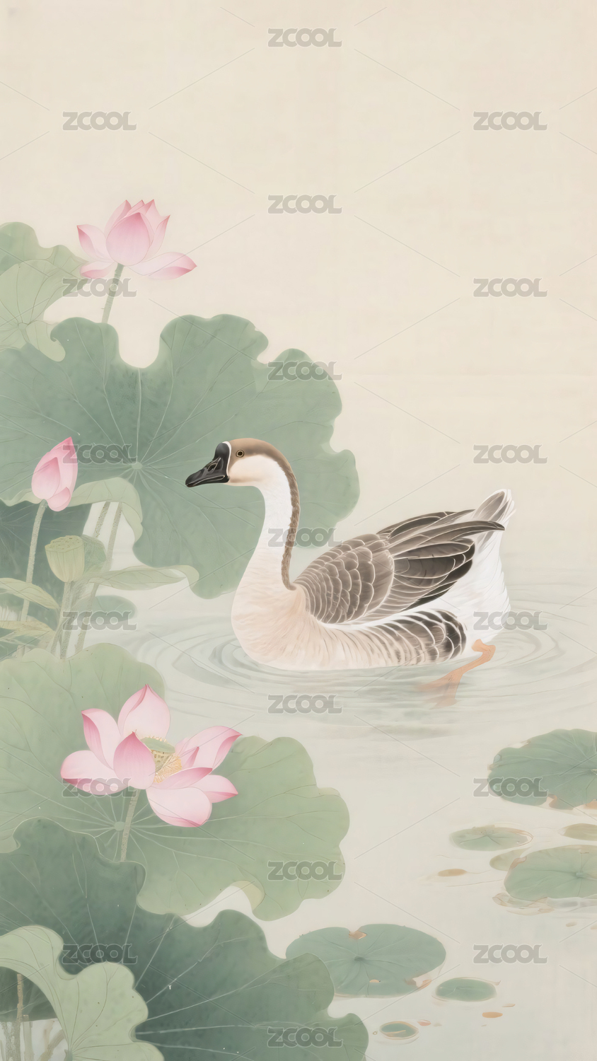 工笔画,荷花,鹅,荷塘,水墨画,中国风,传统,绘画,莲花,荷叶