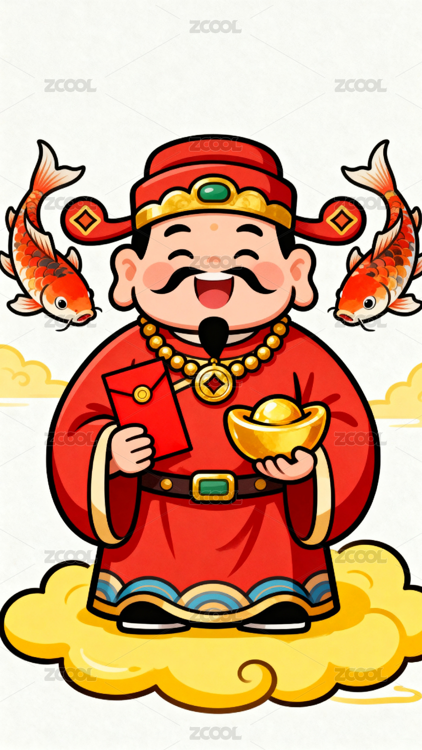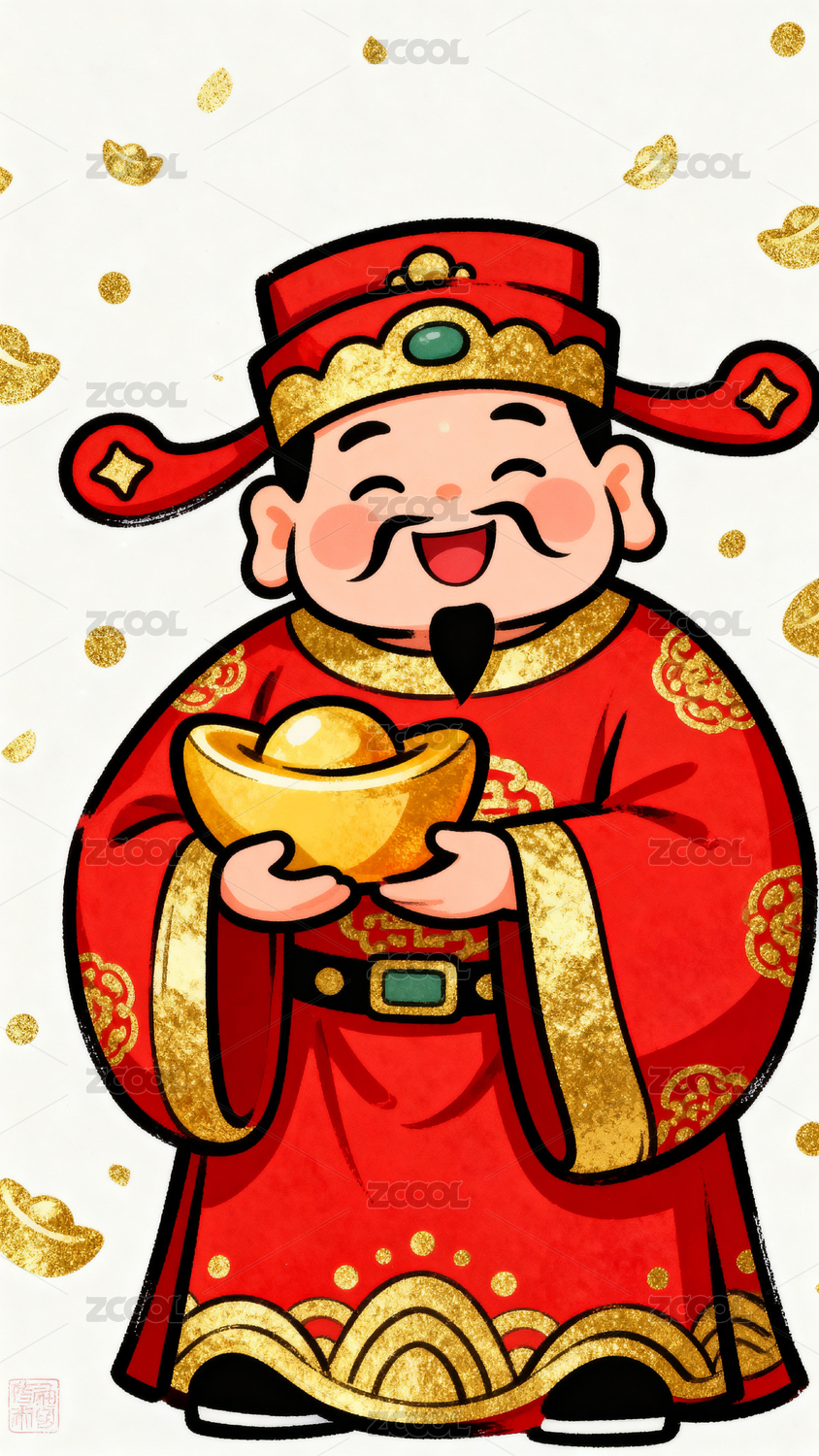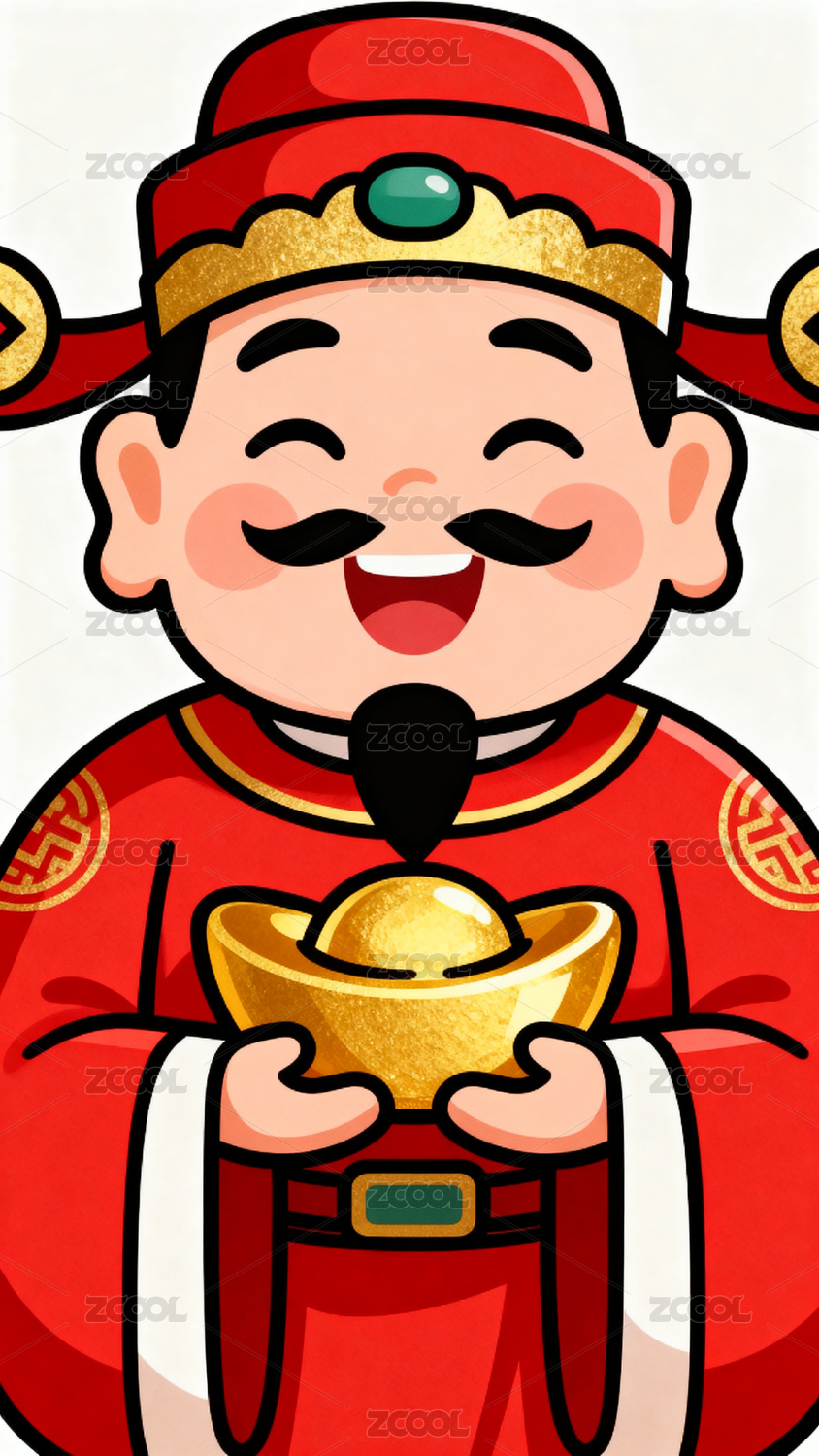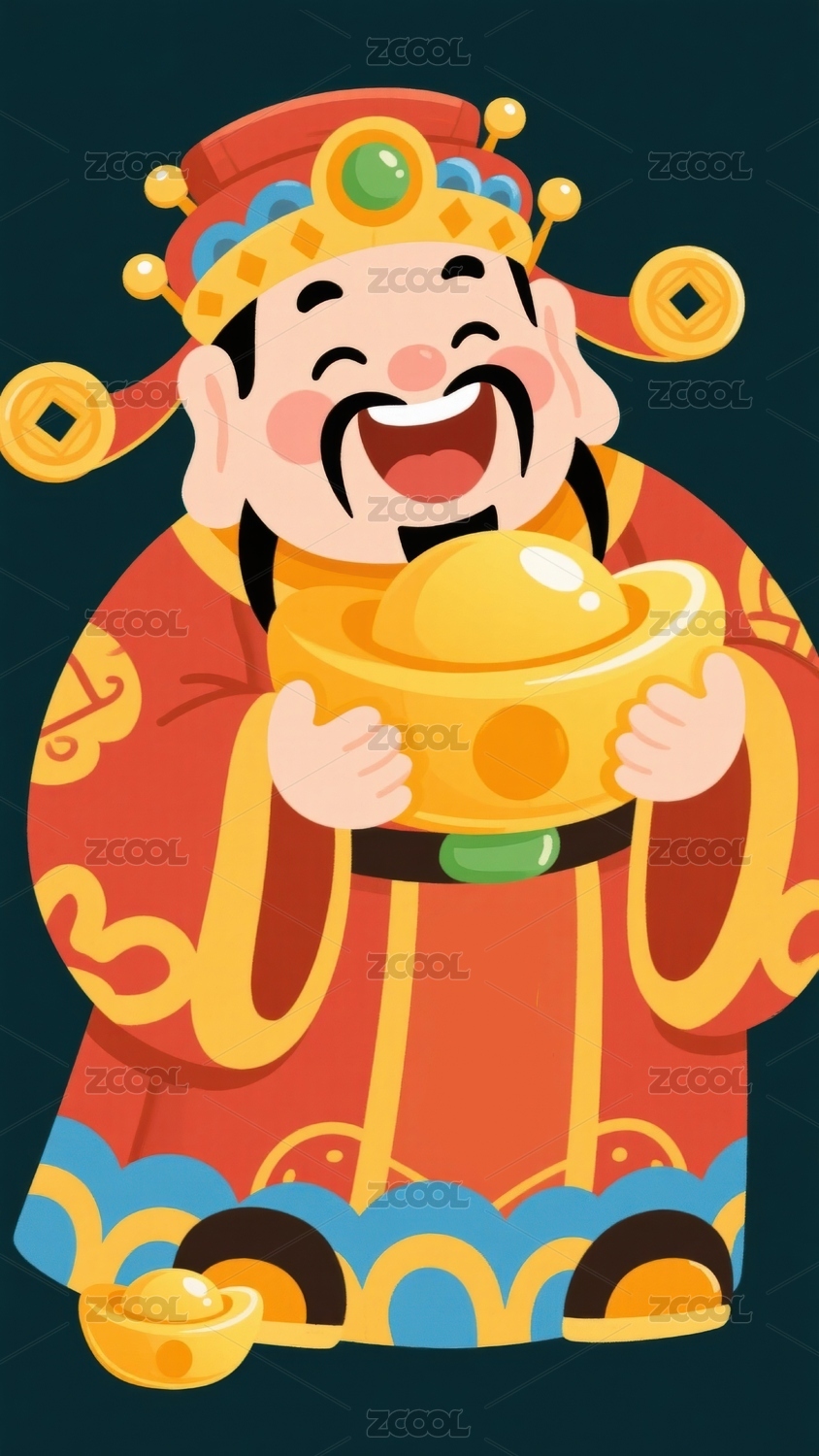 财神,红色,服饰,元宝,笑容,帽子,金色,花纹,传统,服装
