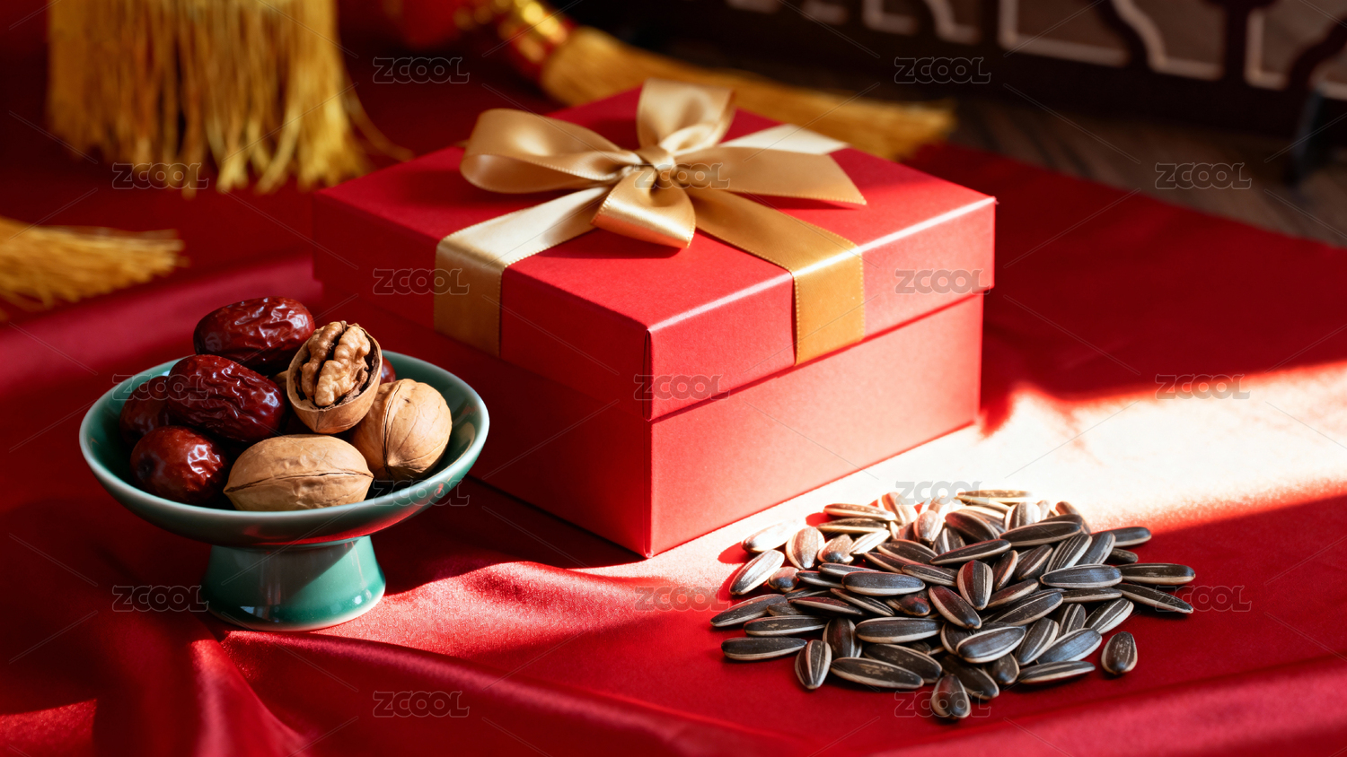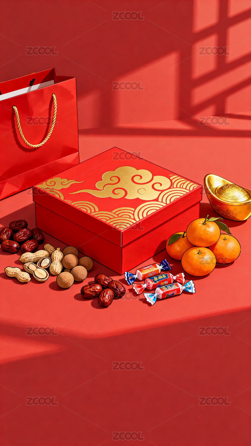 充满中国节日气息的背景下摆放着多个礼品盒及礼品