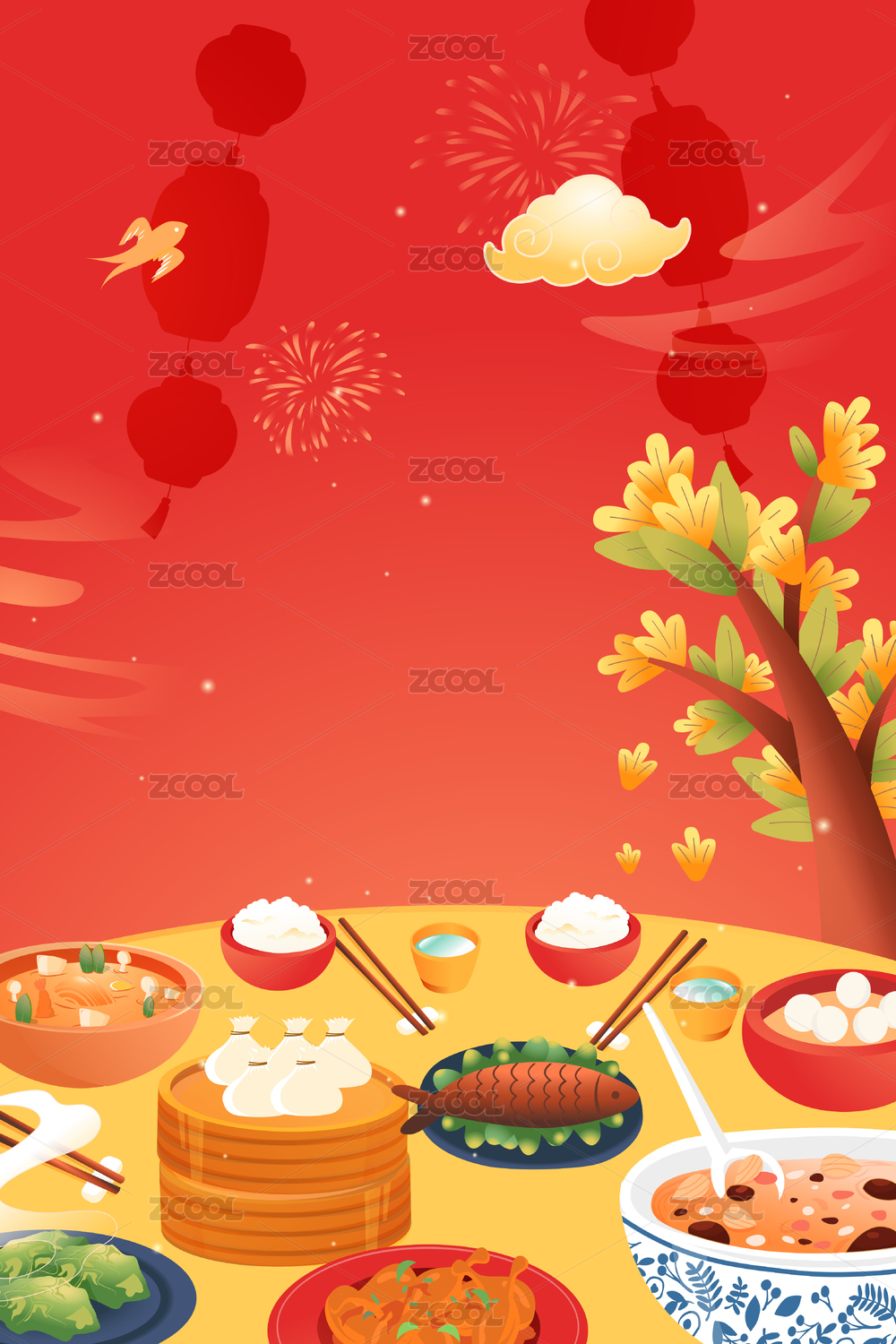 一家人春节围在大圆桌前矢量吃年夜饭插画