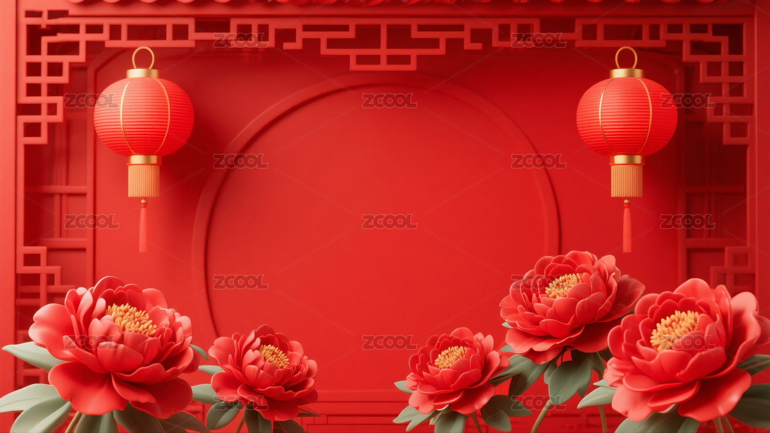 红色灯笼与牡丹花装饰画面