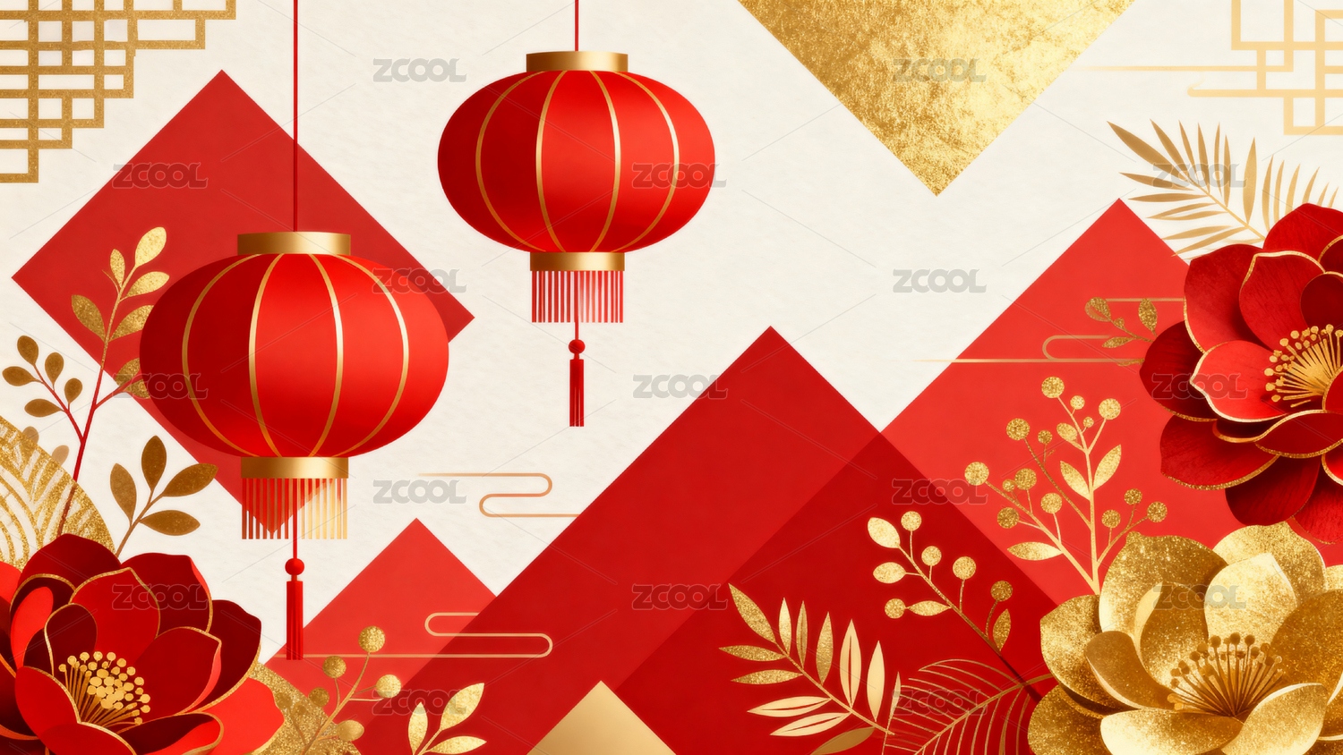 红色灯笼与牡丹花装饰图案