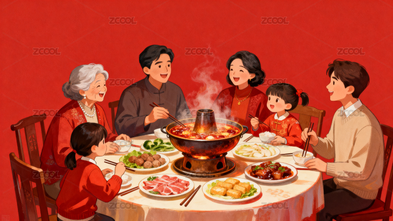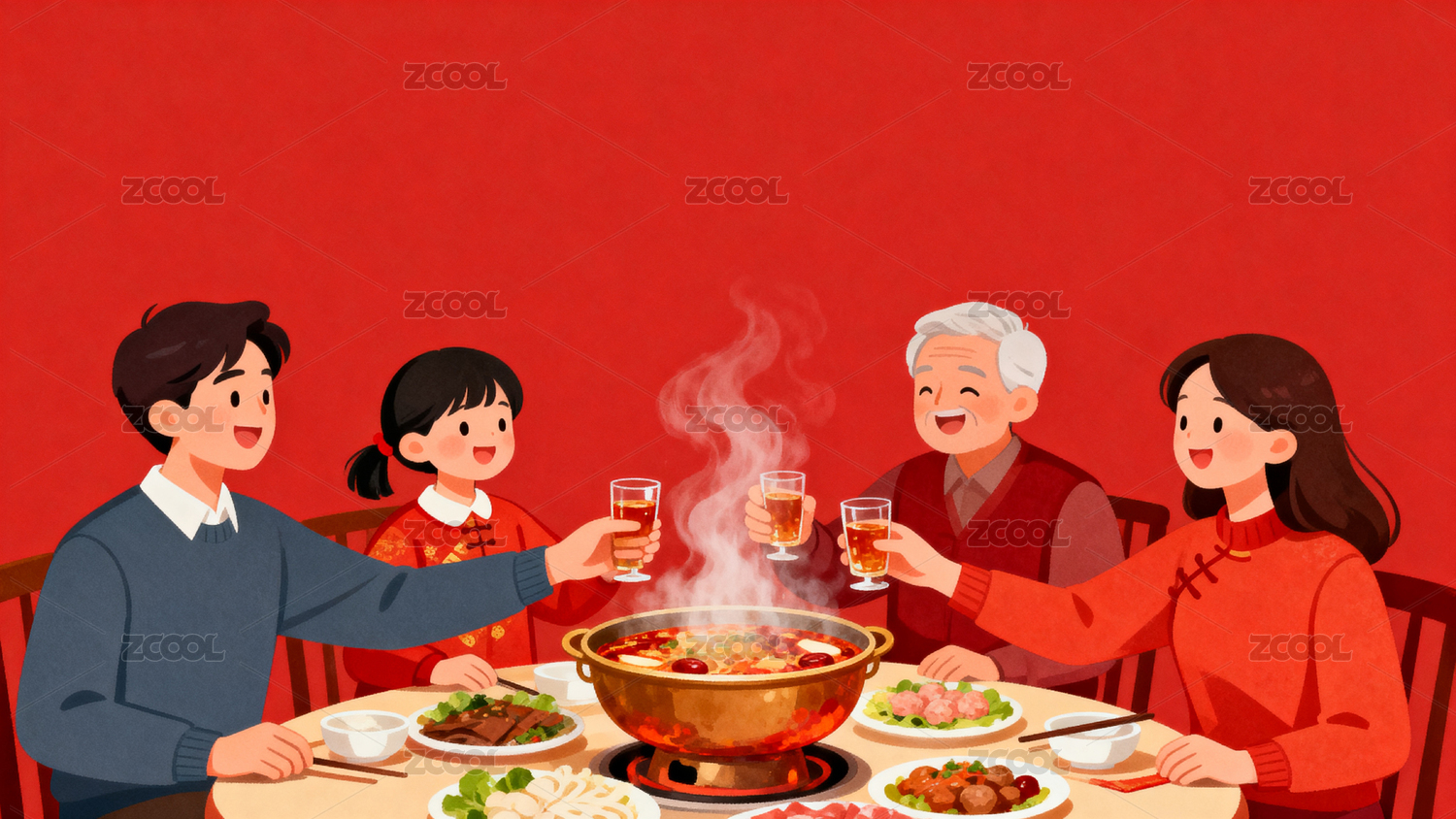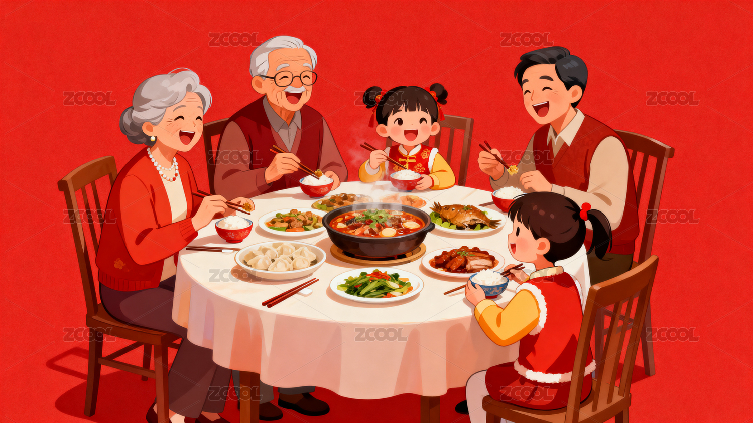 红色,笑容,节日,青年,氛围,服饰,团圆,老人,餐具,米饭