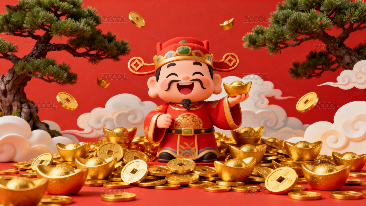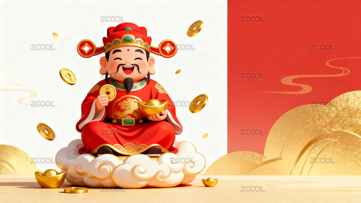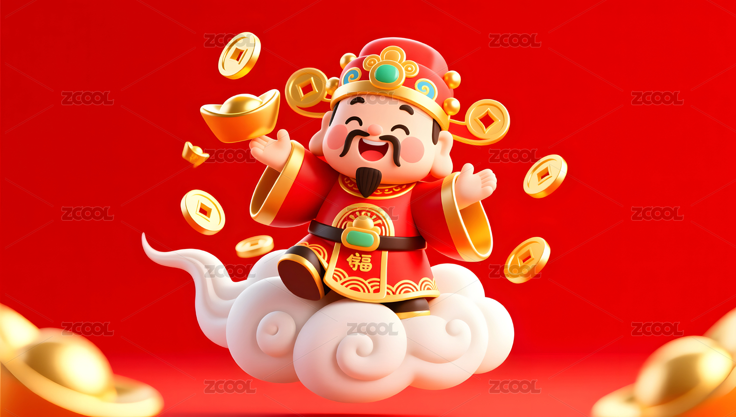 春节财神爷身穿红袍驾云撒元宝