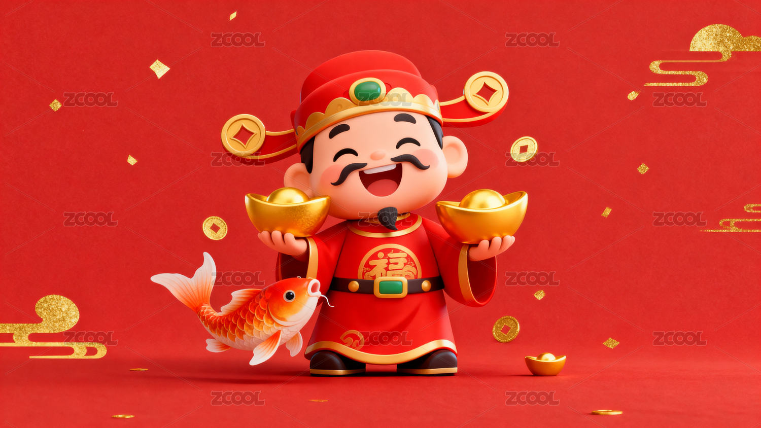 新年财神手持金元宝鱼