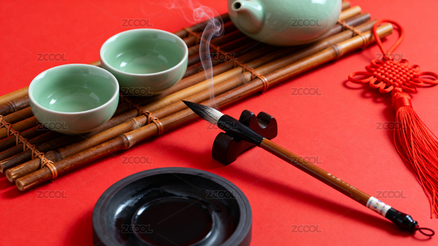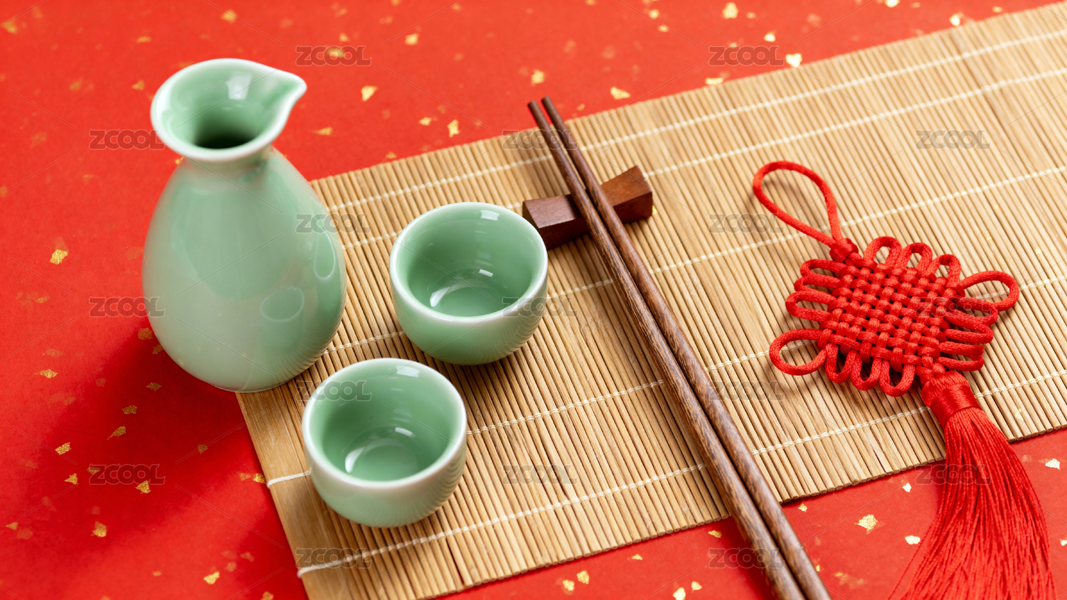 梅子青酒壶酒杯摆放在红色洒金背景上旁边放有中国结木托盘
