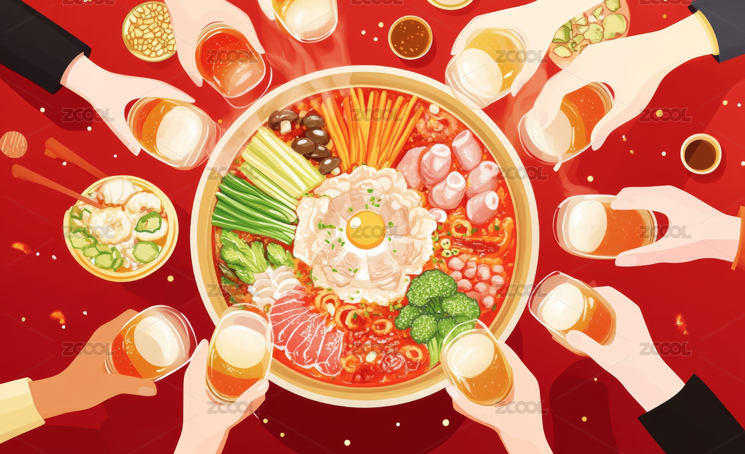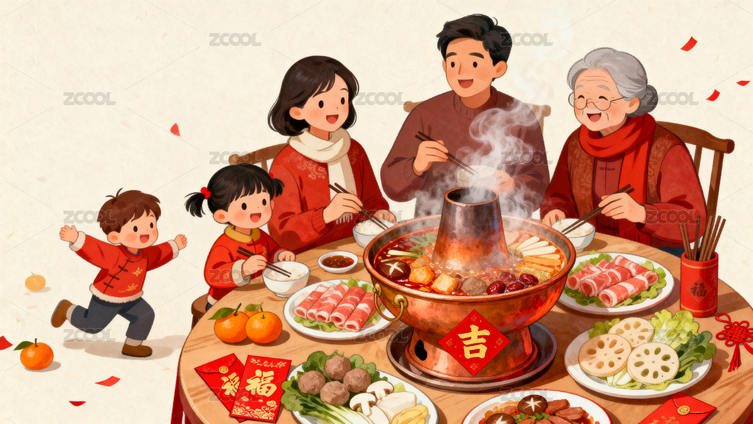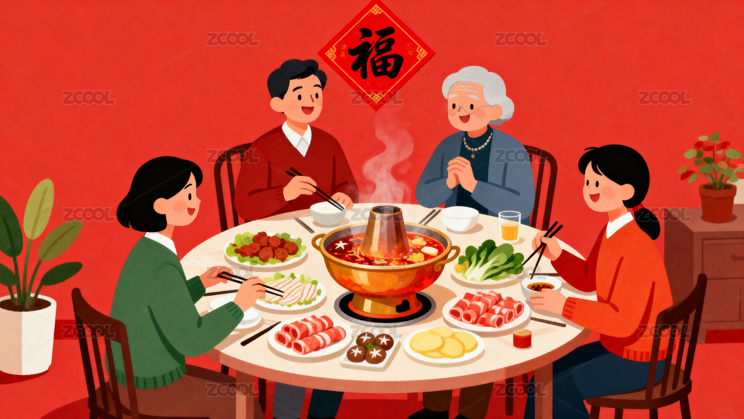 红色,福字,新年,冬季,庆祝,食物,火锅,热气,饮料,水果