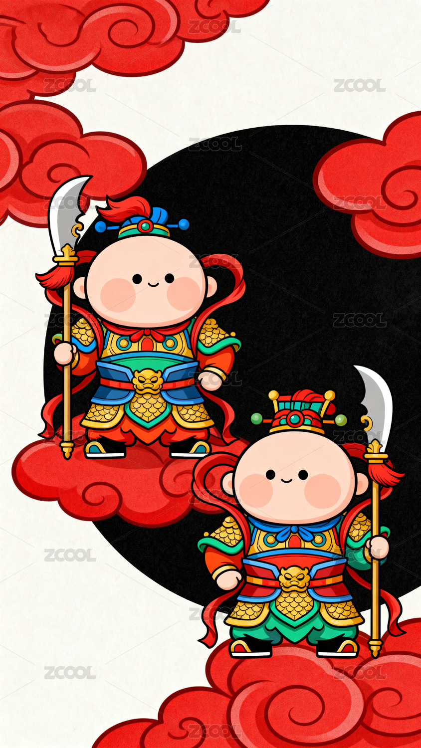 传统,文化,装饰,门神,武将,红衣,铠甲,龙头,旗帜,长枪