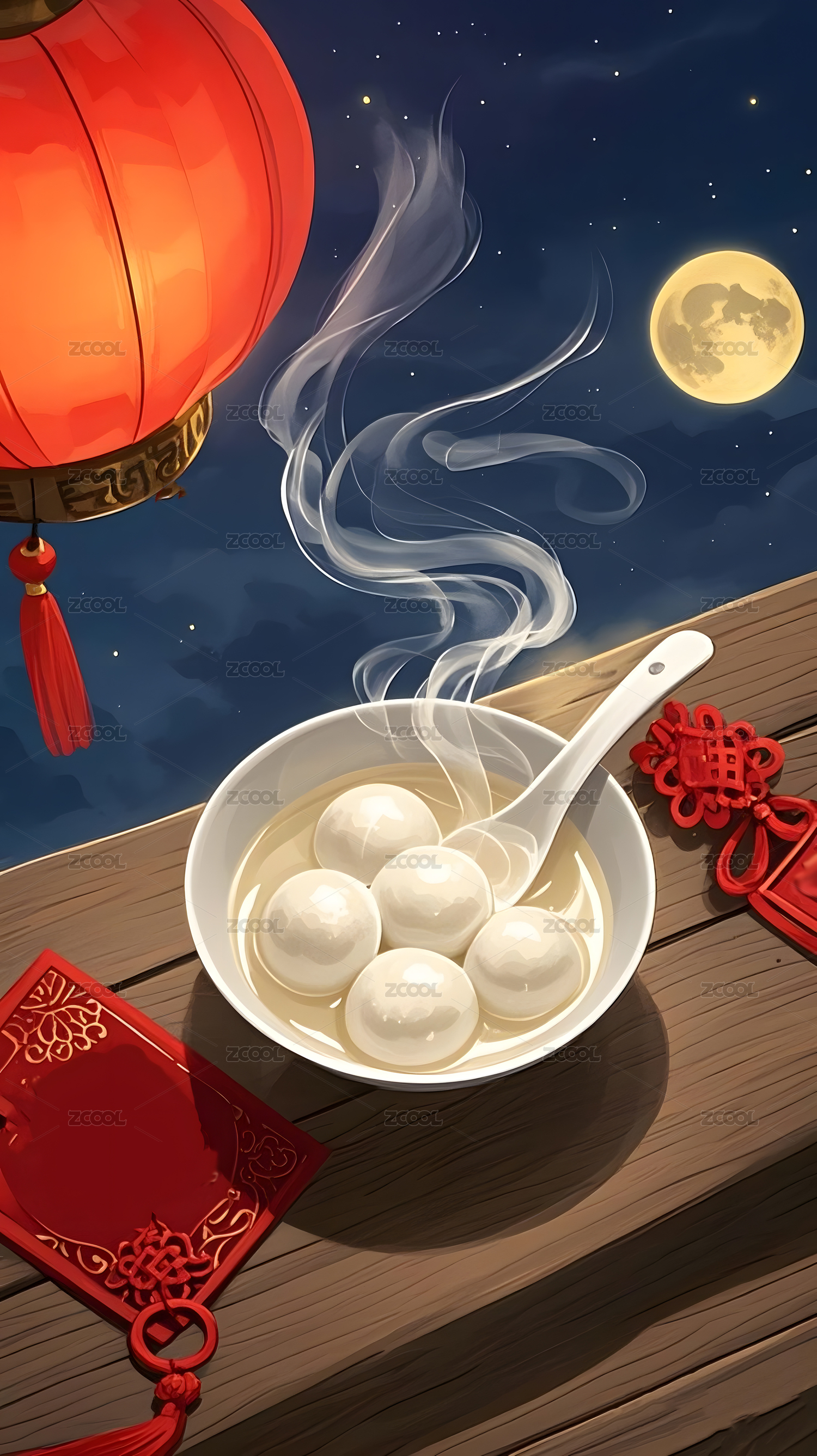 传统,节日,红色,喜庆,灯笼,烟花,夜空,汤圆,碗,月亮