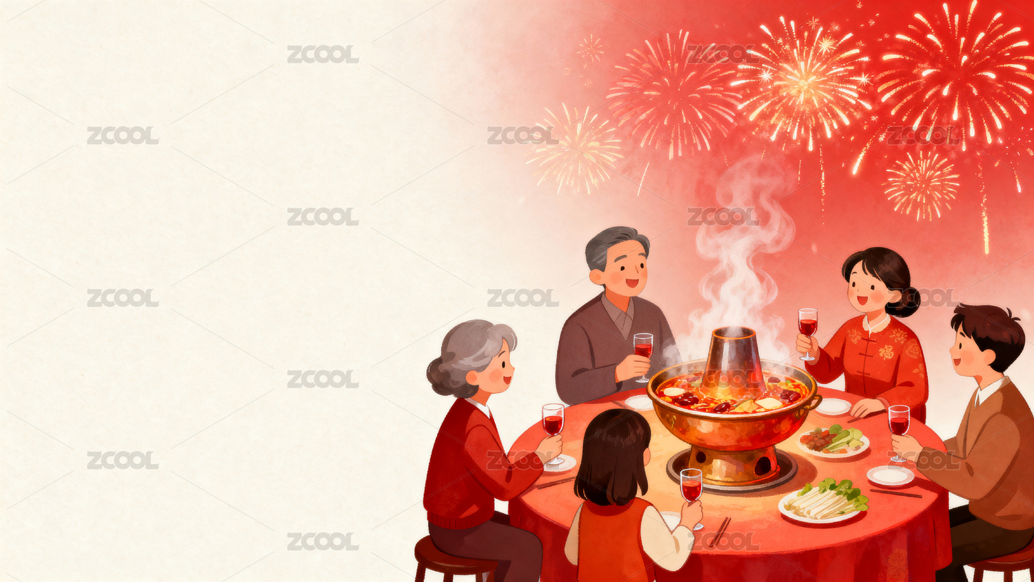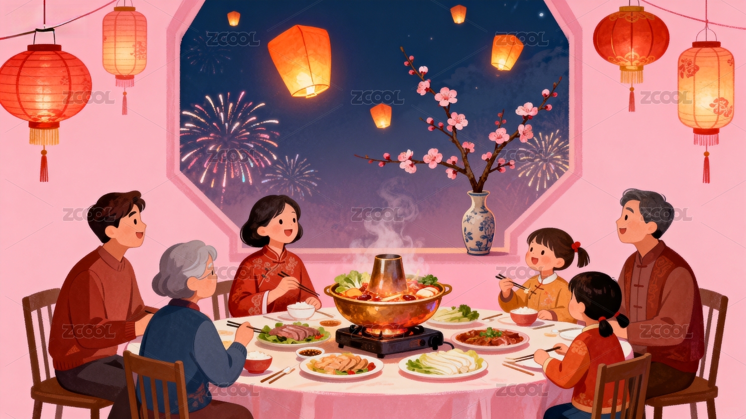 节日,烟花,庆祝,老人,青年,家人,火锅,欢庆,夜空,灯光