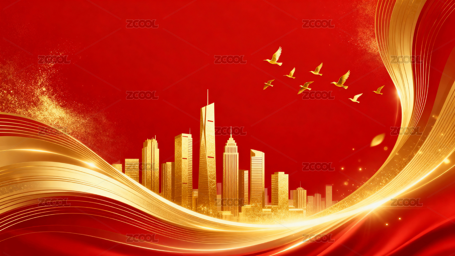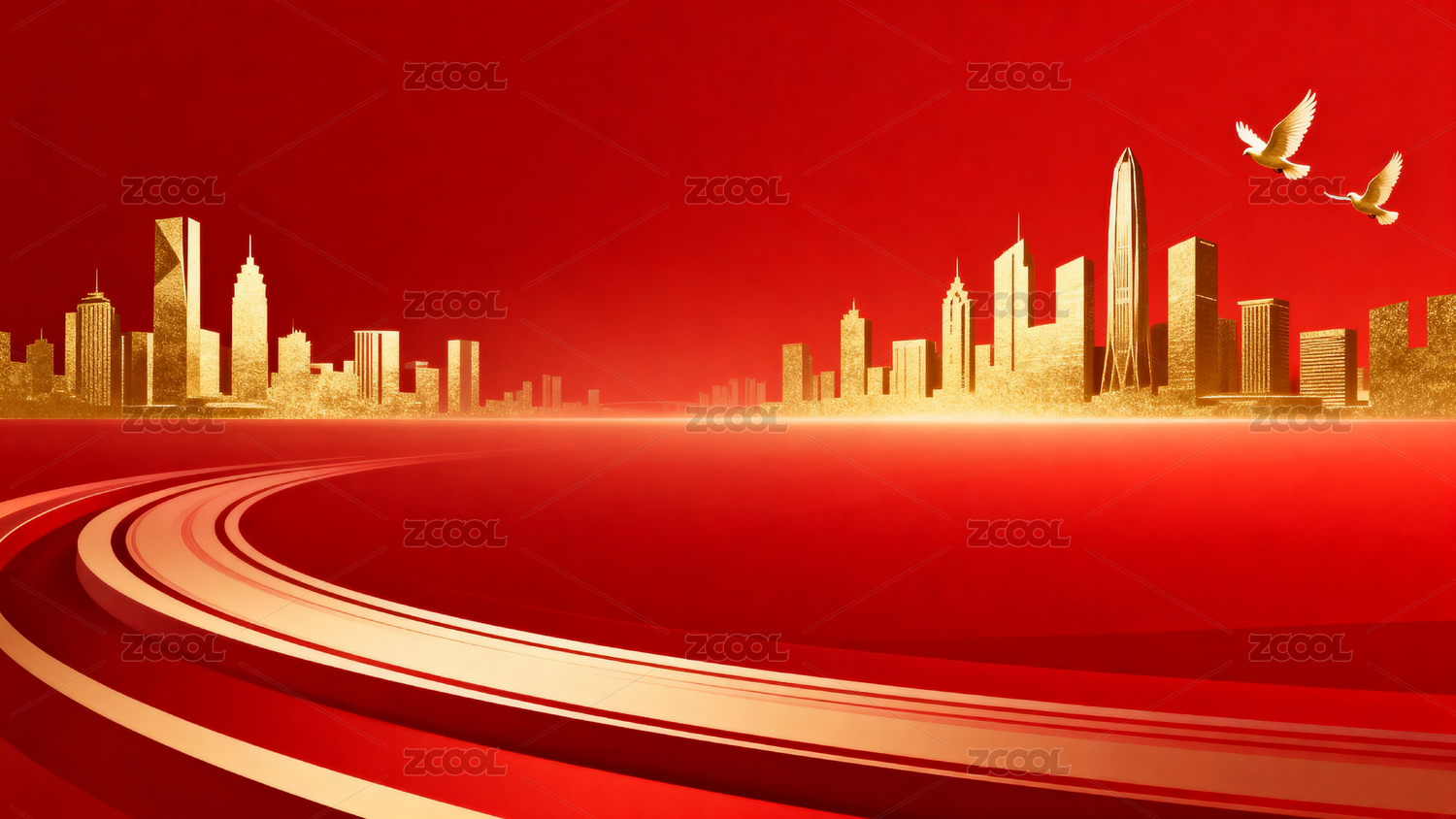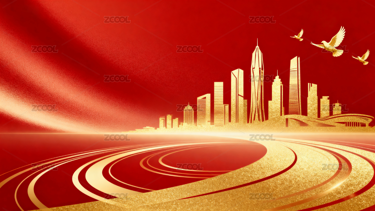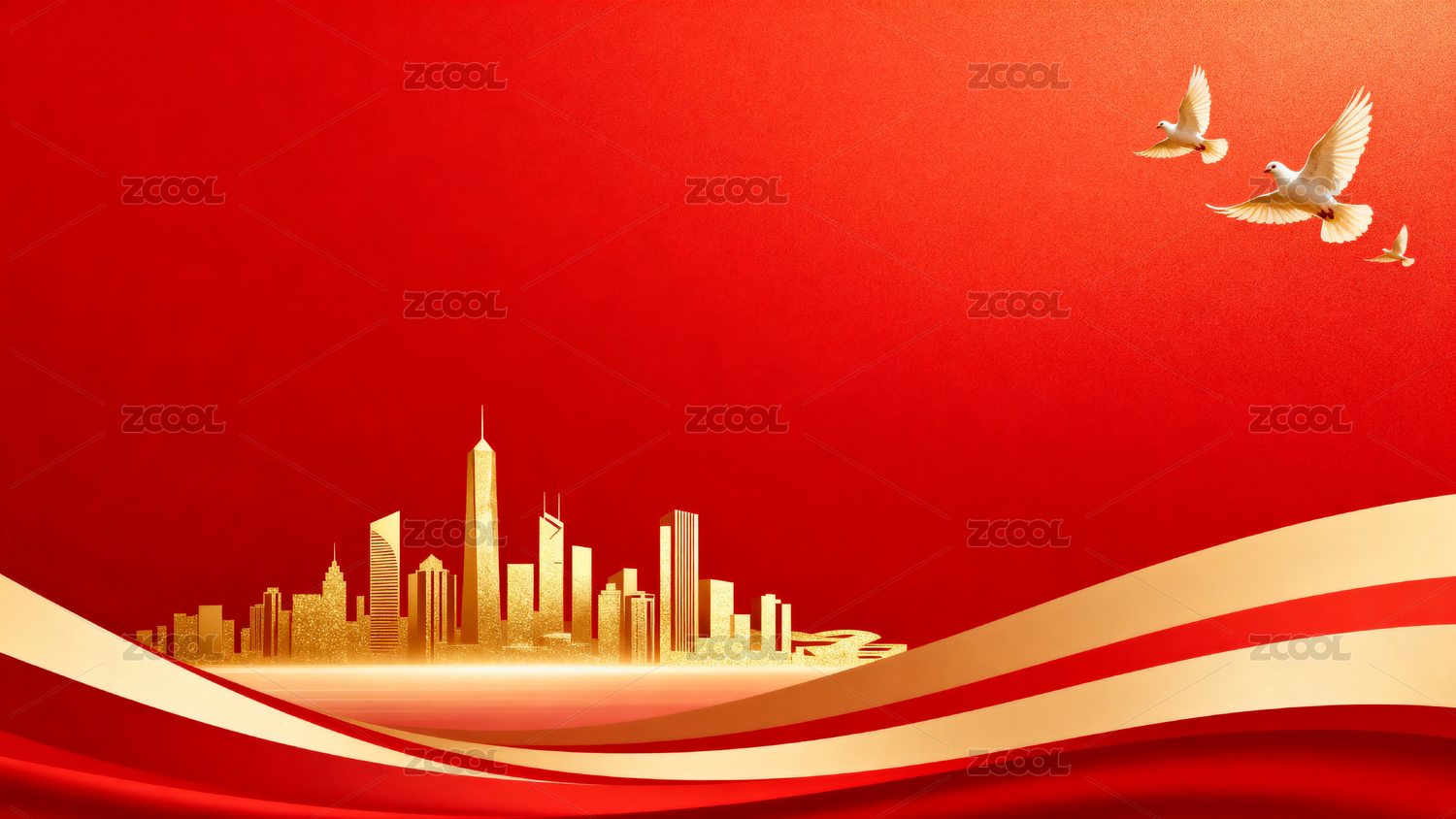 红色背景金色城市飞鸽图