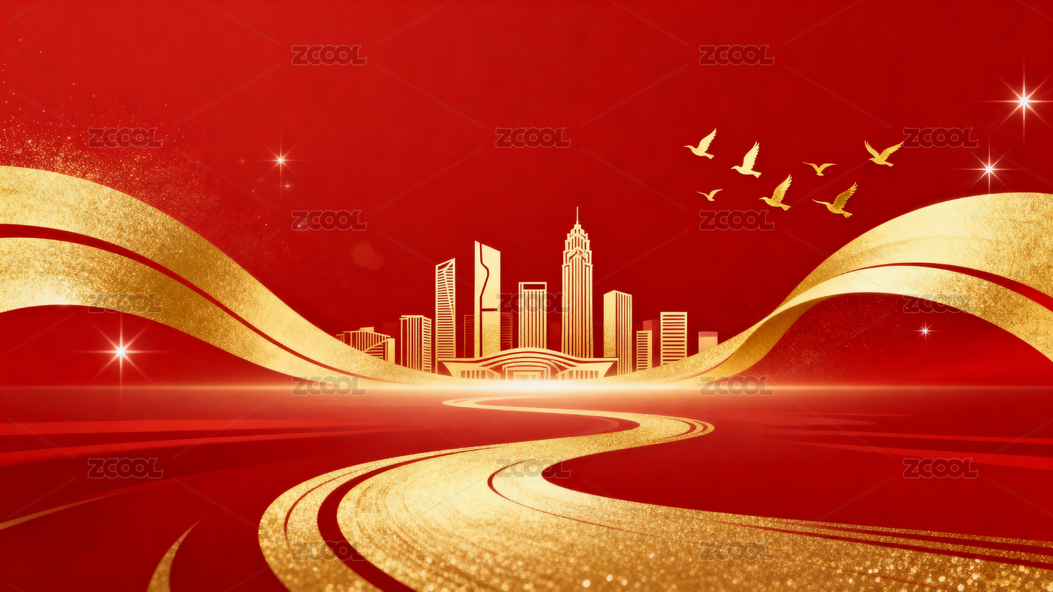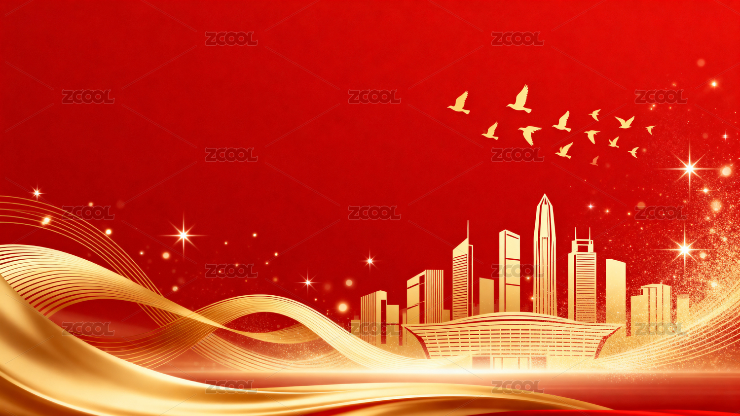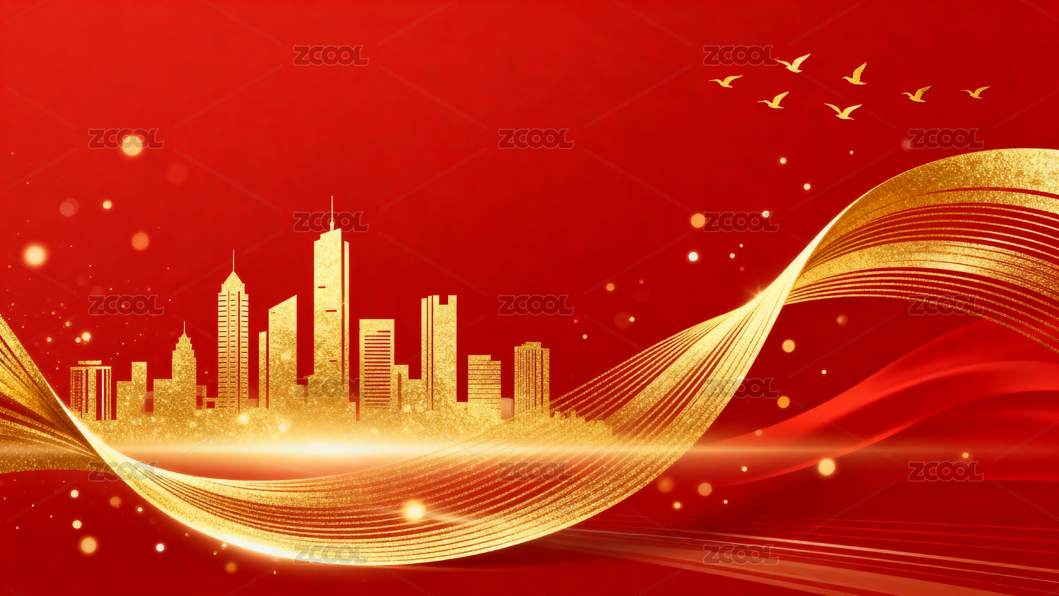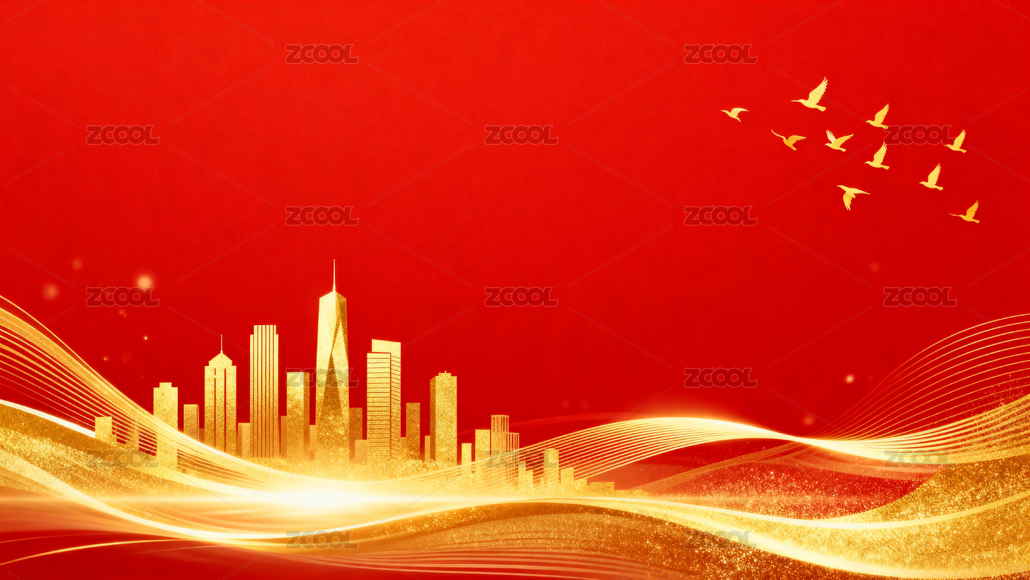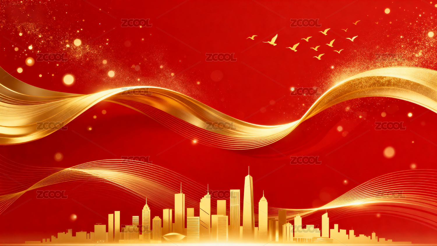 红色背景金色城市飞鸽图