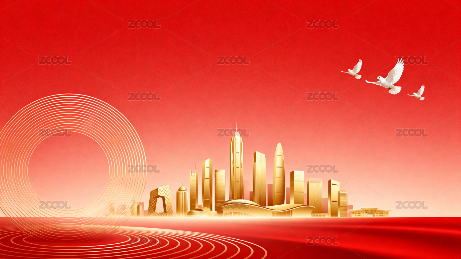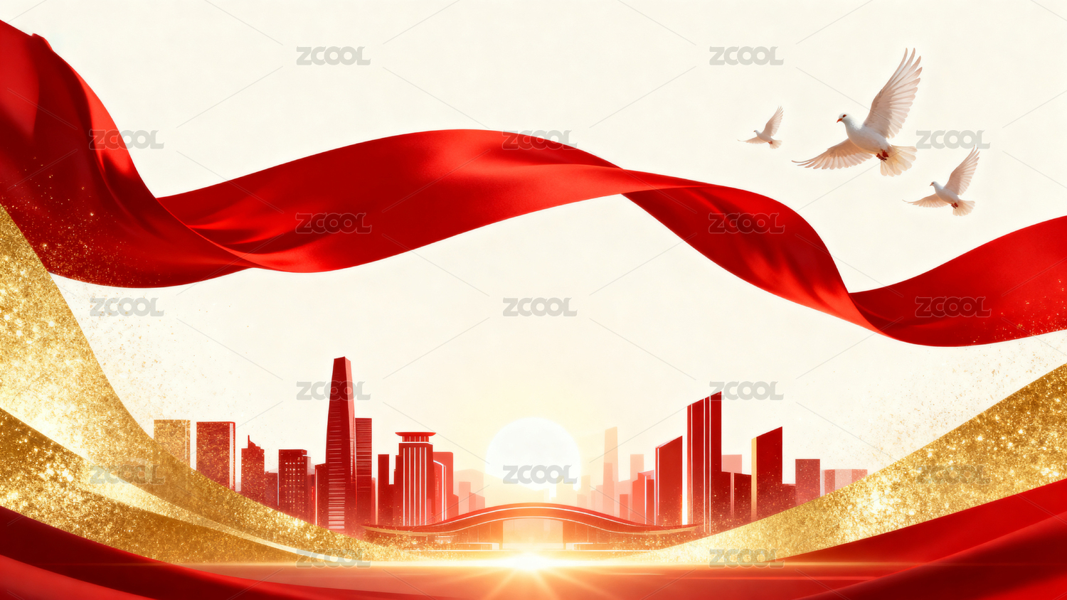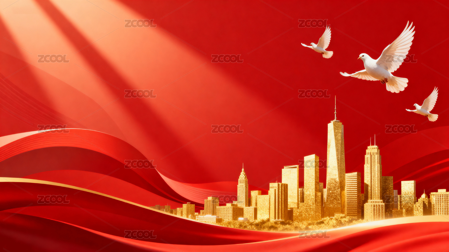 红色背景下的金色城市与飞翔白鸽