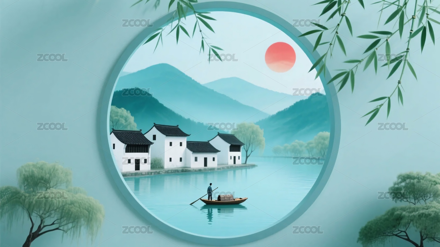 水乡,小船,人物,房屋,竹子,山水,红日,插画,风景,自然