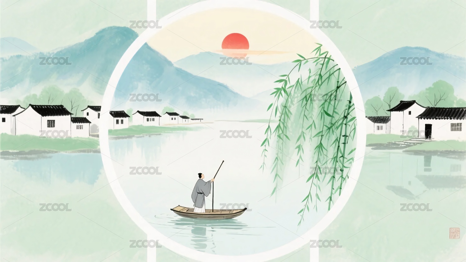 中式山水划船插画