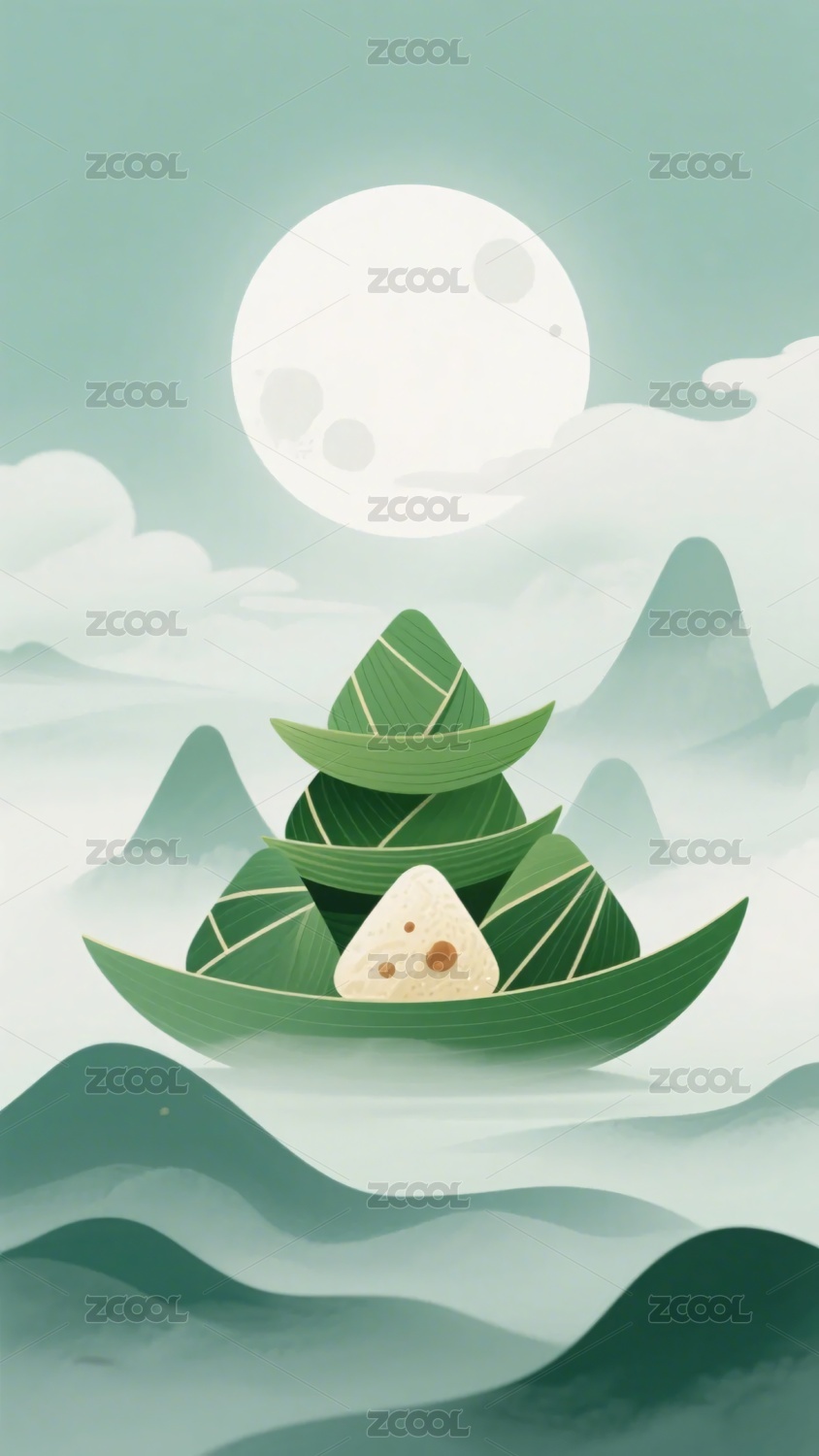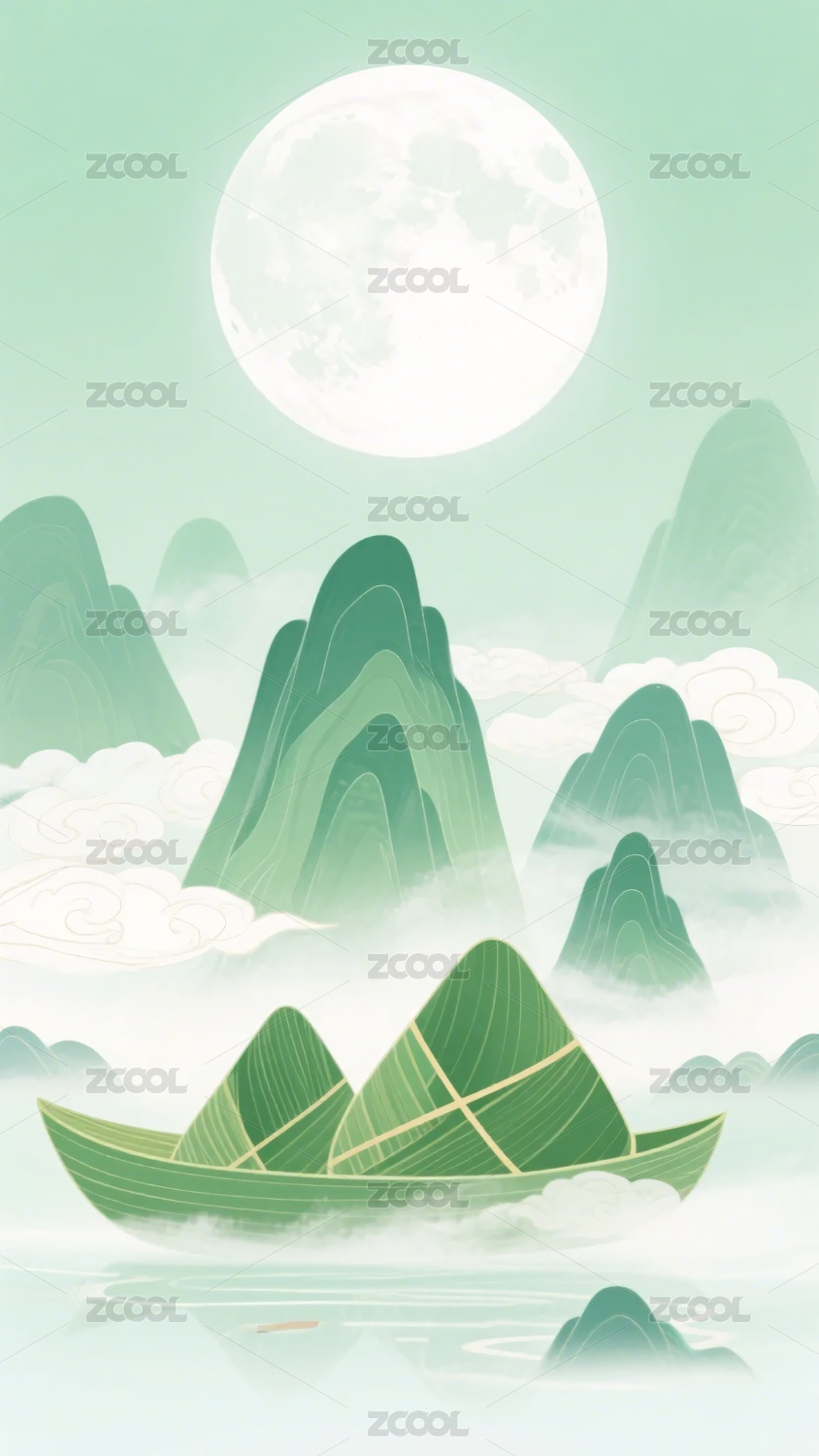 月亮,山峦,云雾,粽叶船,粽子,插画,风景,自然,节日,传统