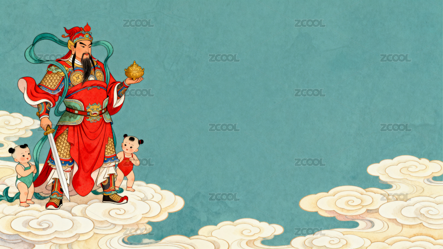 红色背景中的金色神将形象