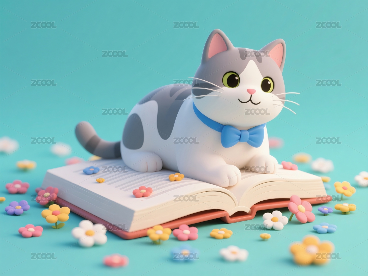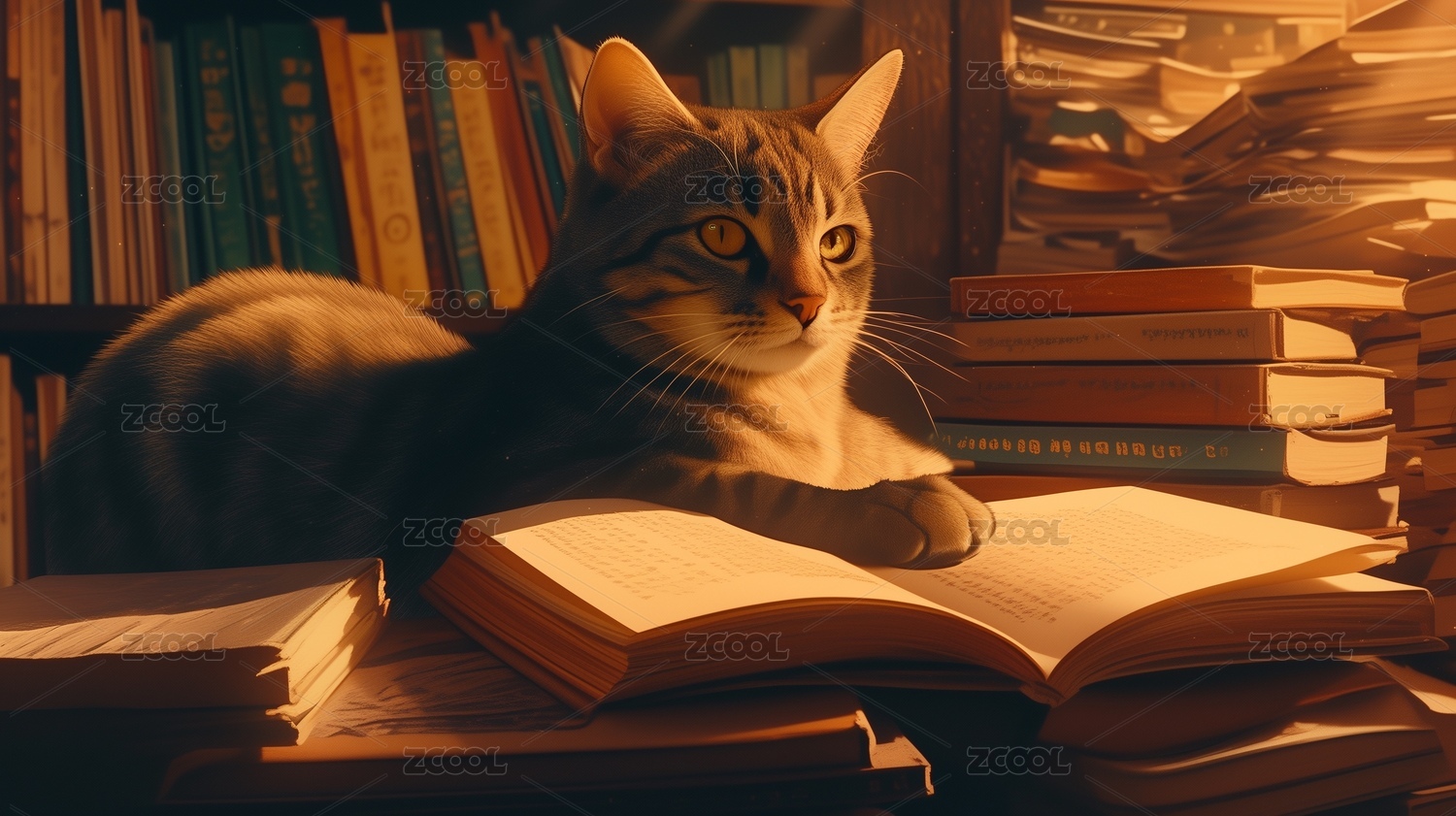 书架前戴着眼镜看书的萌宠英短蓝白猫猫