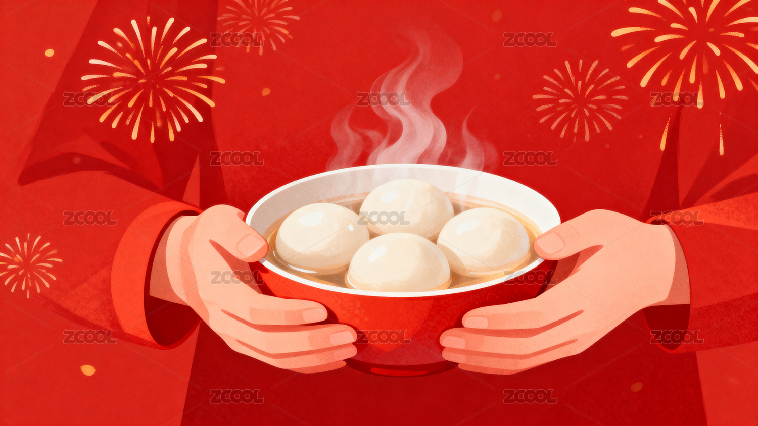 双手捧红碗汤圆烟花绽放