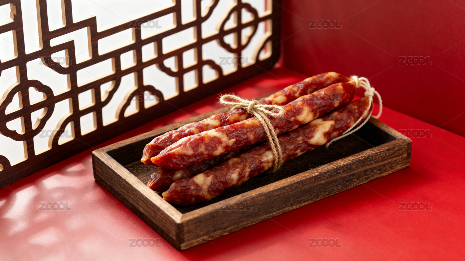 红色场景前的年味美食腊肠