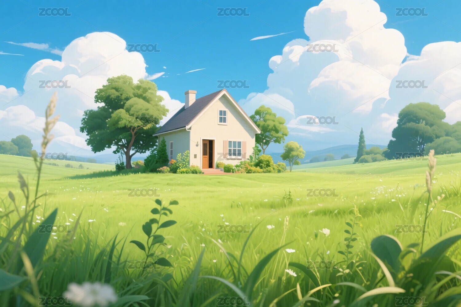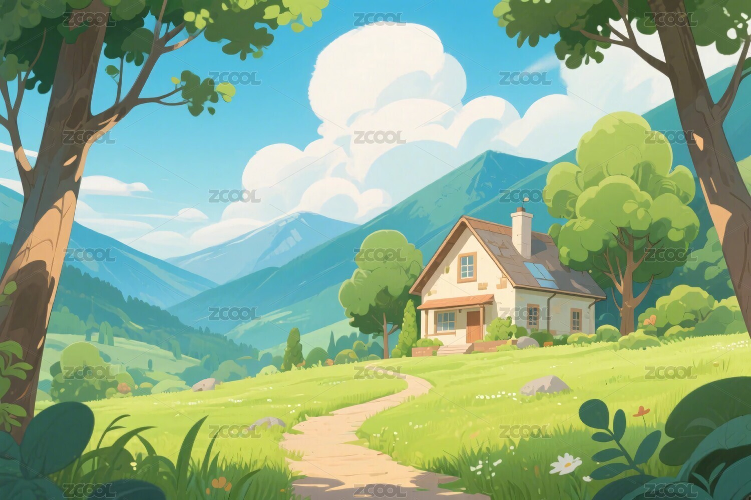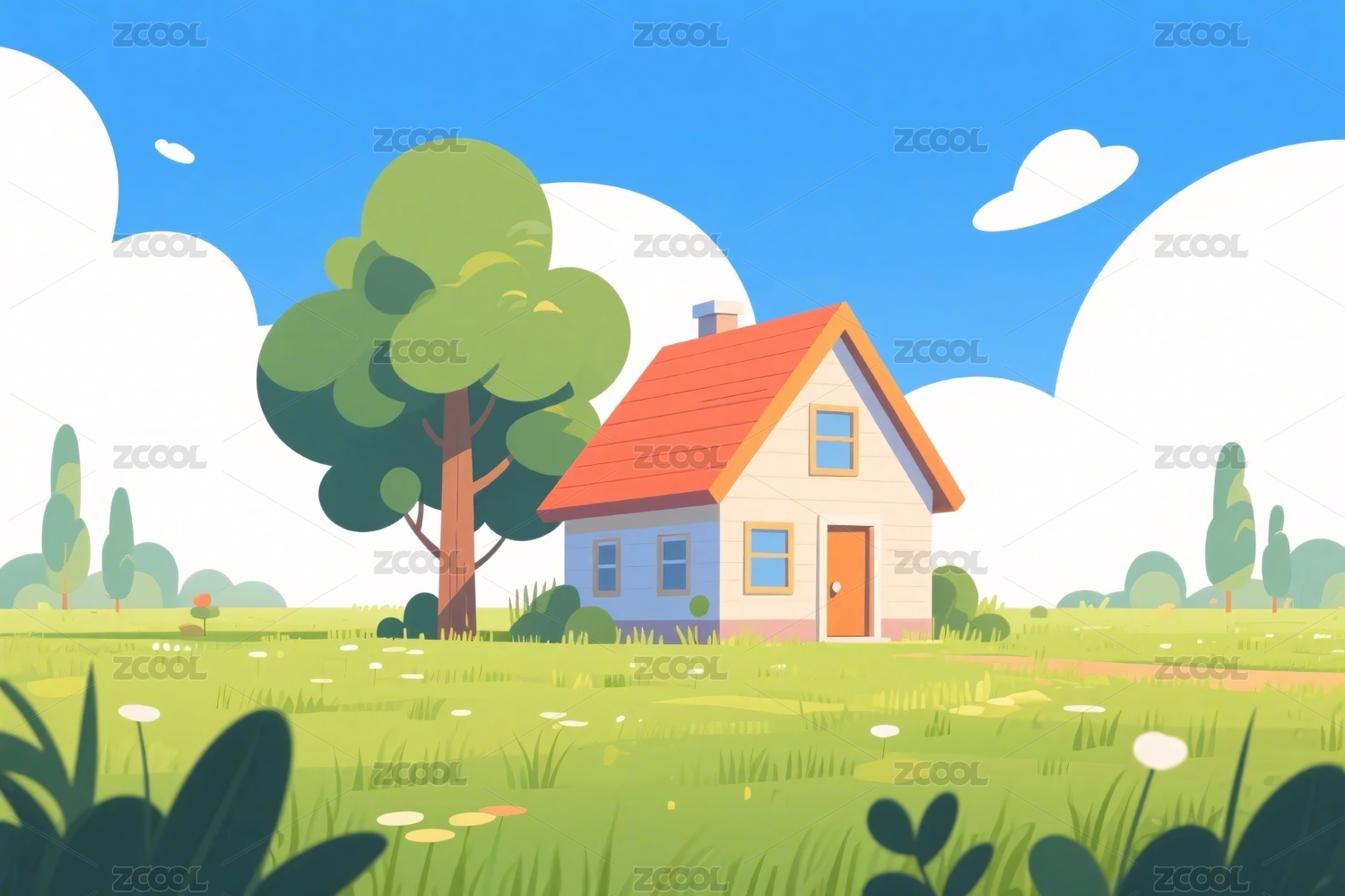 乡村,风景,房屋,树木,草地,蓝天,白云,绿树,卡通,矢量