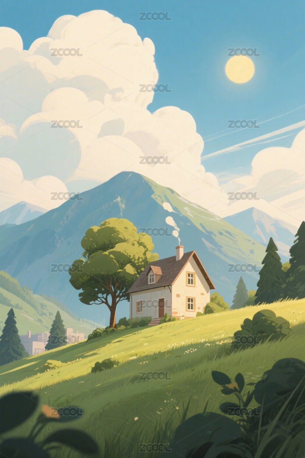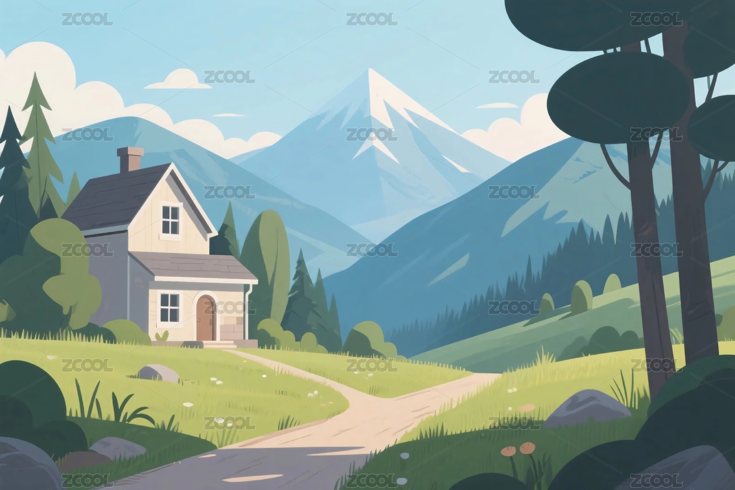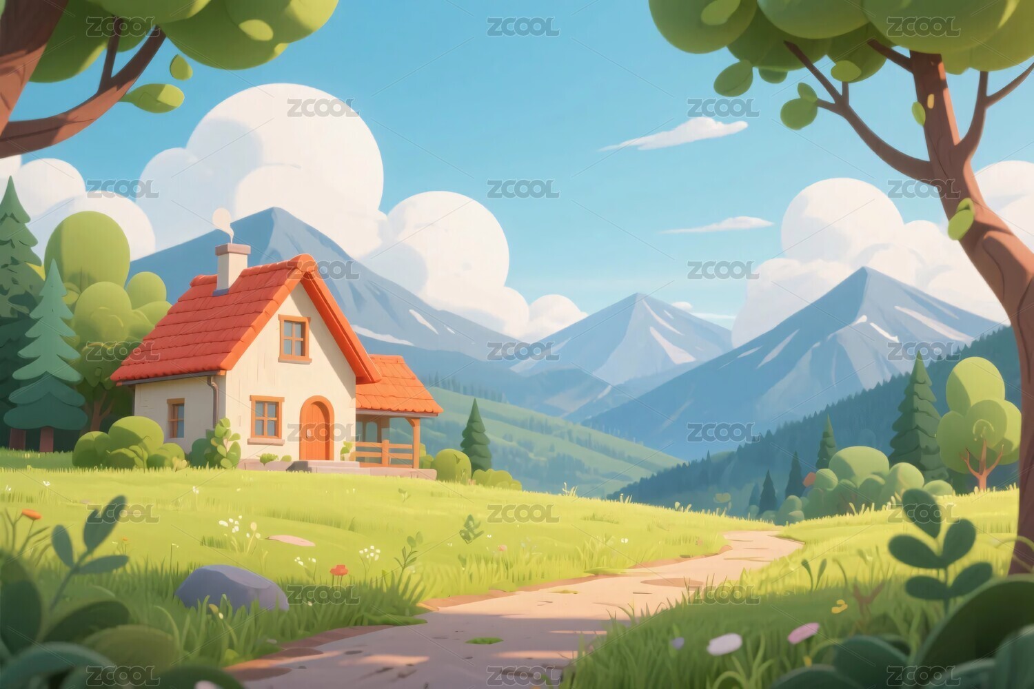 乡村,风景,房屋,树木,草地,蓝天,白云,绿树,卡通,矢量