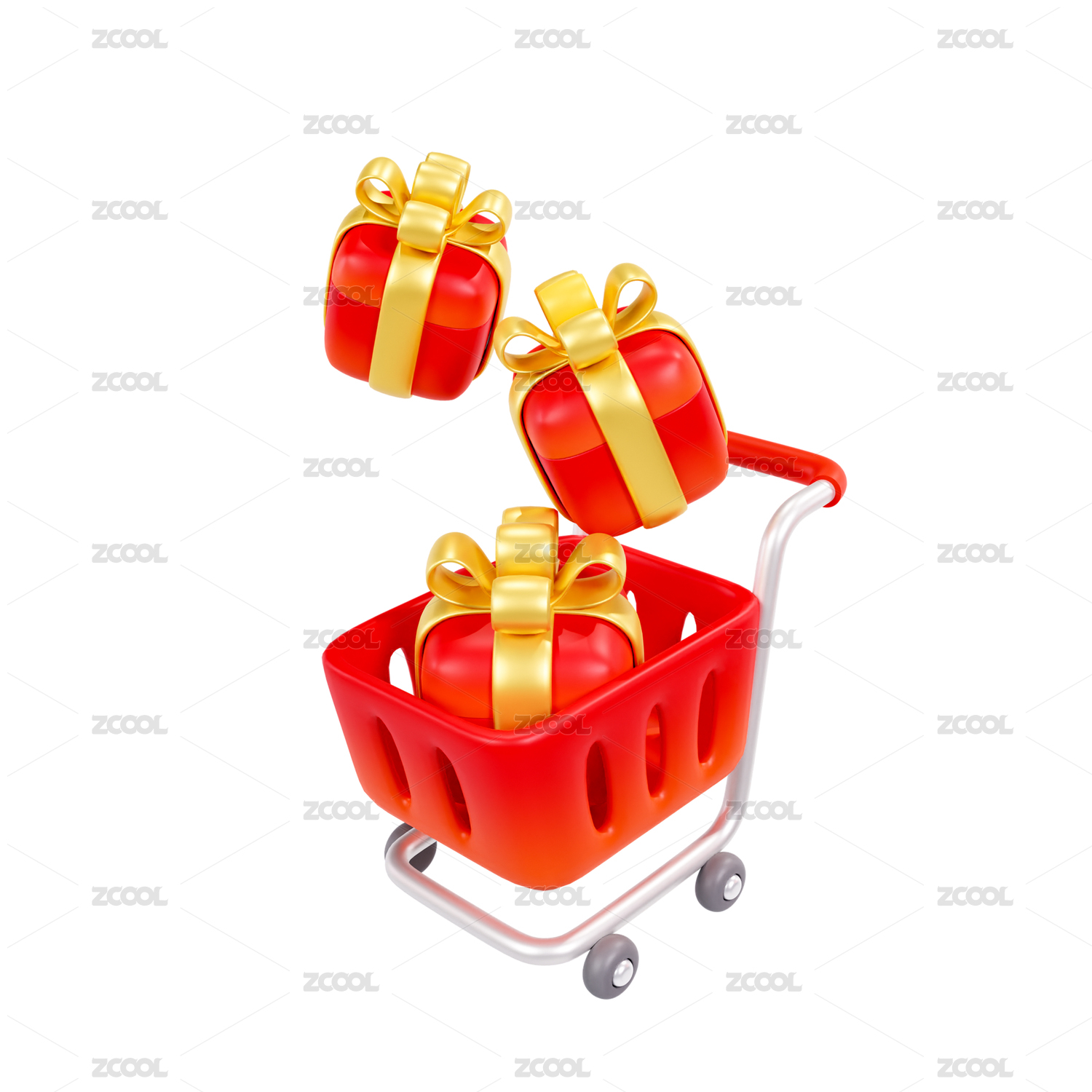 3D渲染的装着礼盒购物袋的购物篮春节红色