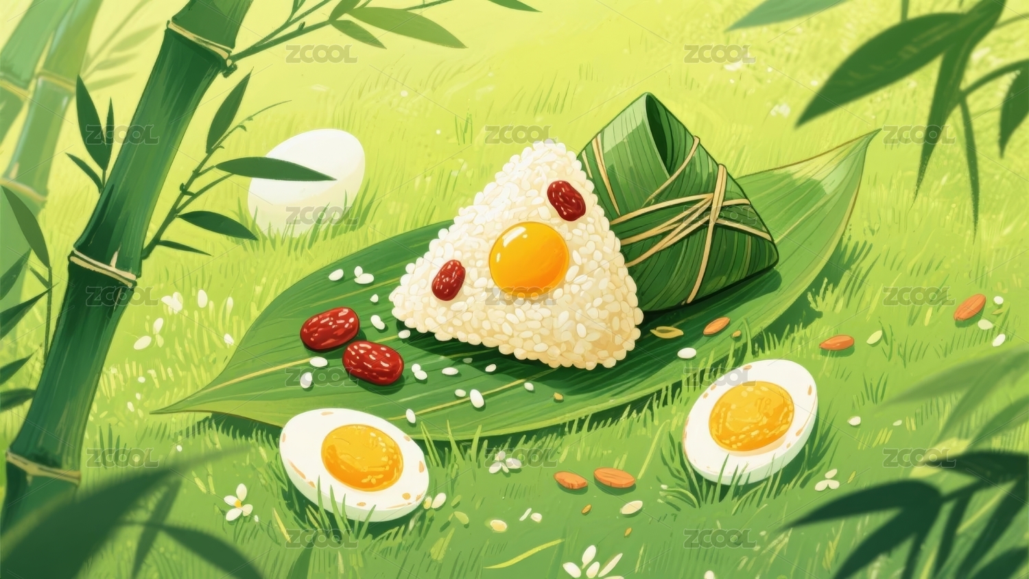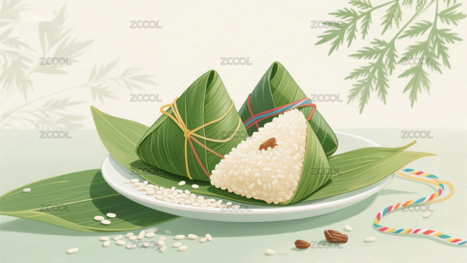 粽子,粽叶,粽绳,糯米,米饭,插画,美食,手绘,绿植,竹叶
