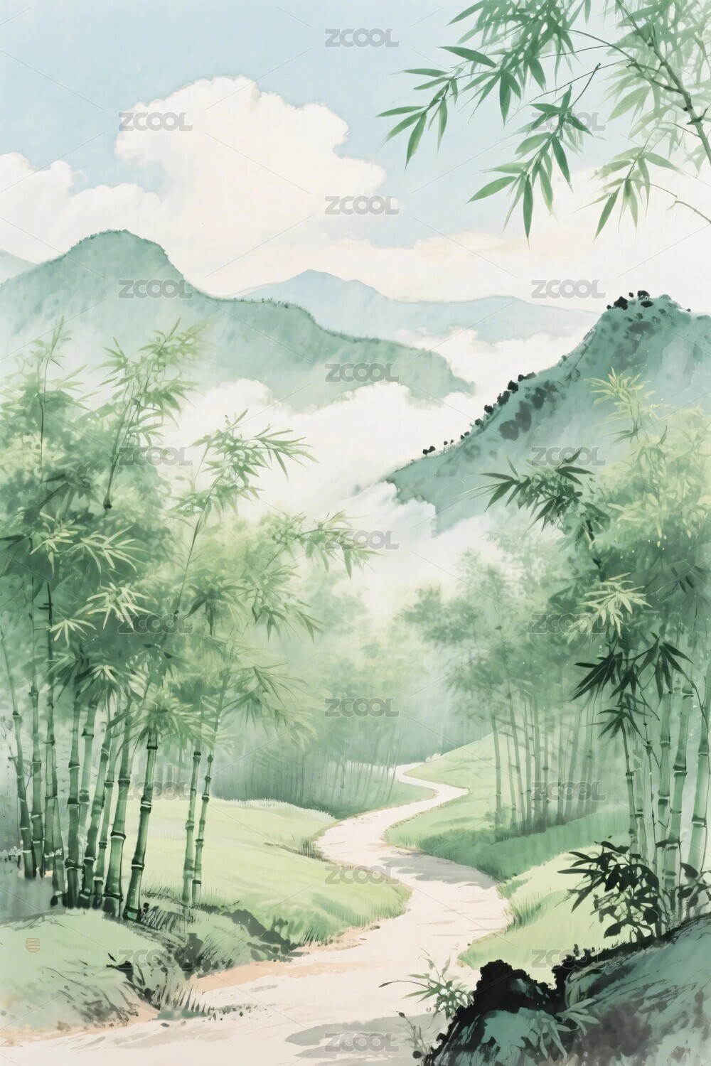 山水,竹子,云雾,小径,插画,水墨,自然,古风,手绘,景观