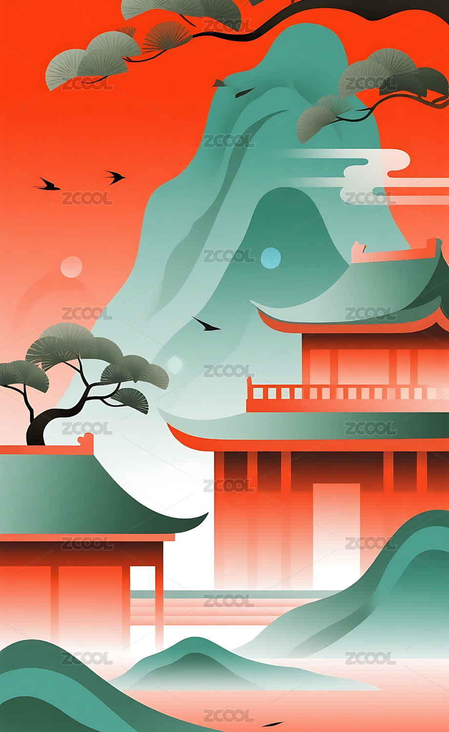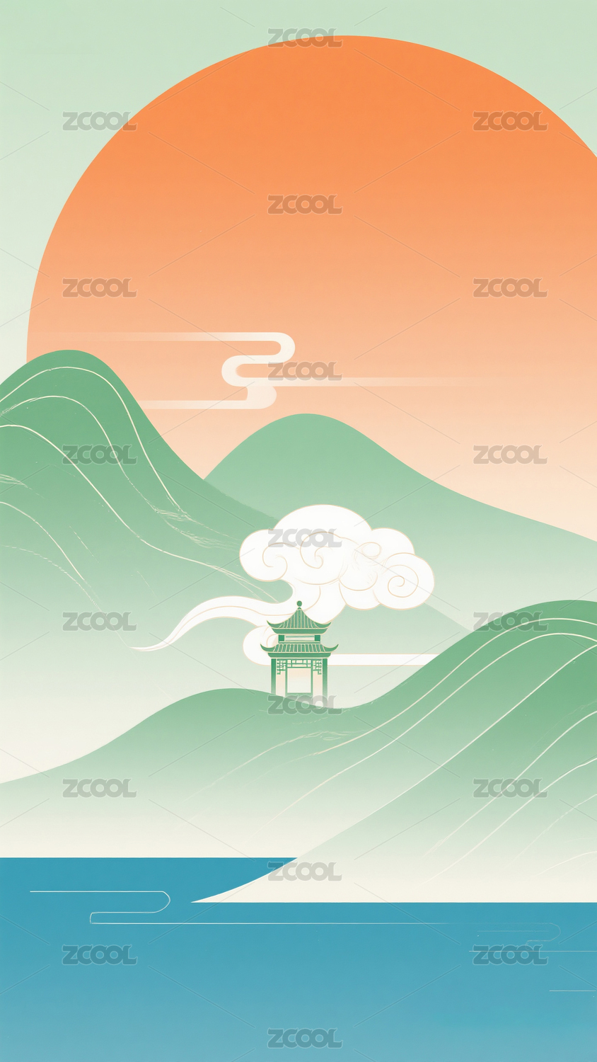 中国风,国风,简约,背景,装饰,新中式,山峰,树木,松树,渐变