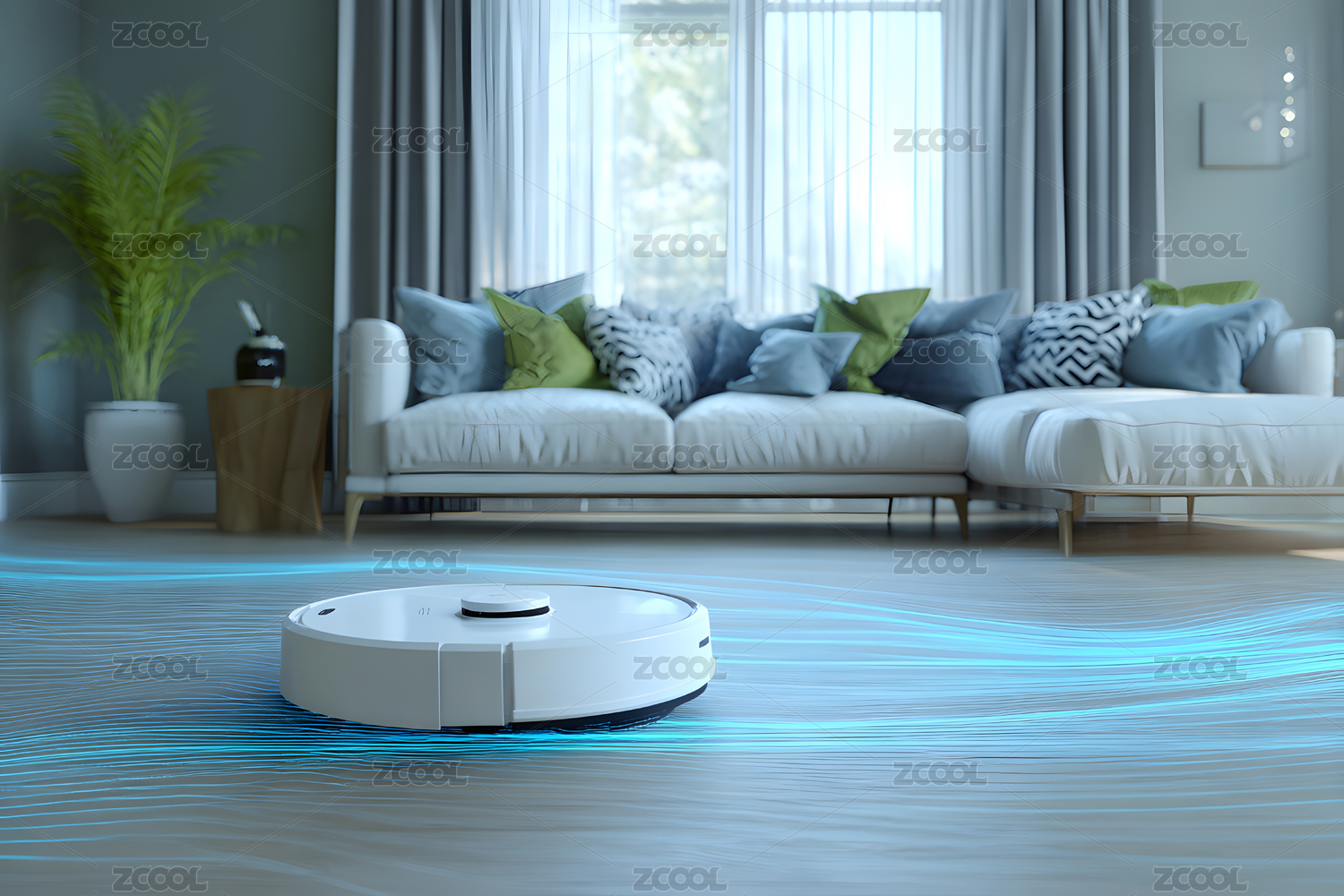 智能扫地机器人在现代客厅工作