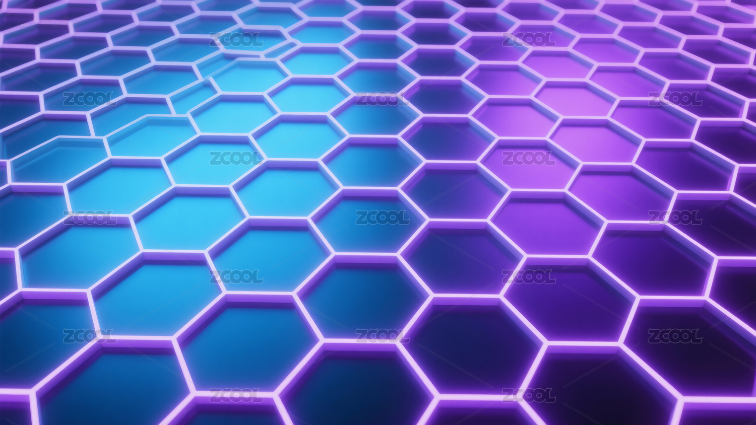 紫色背景下发光的蓝色六边形网格