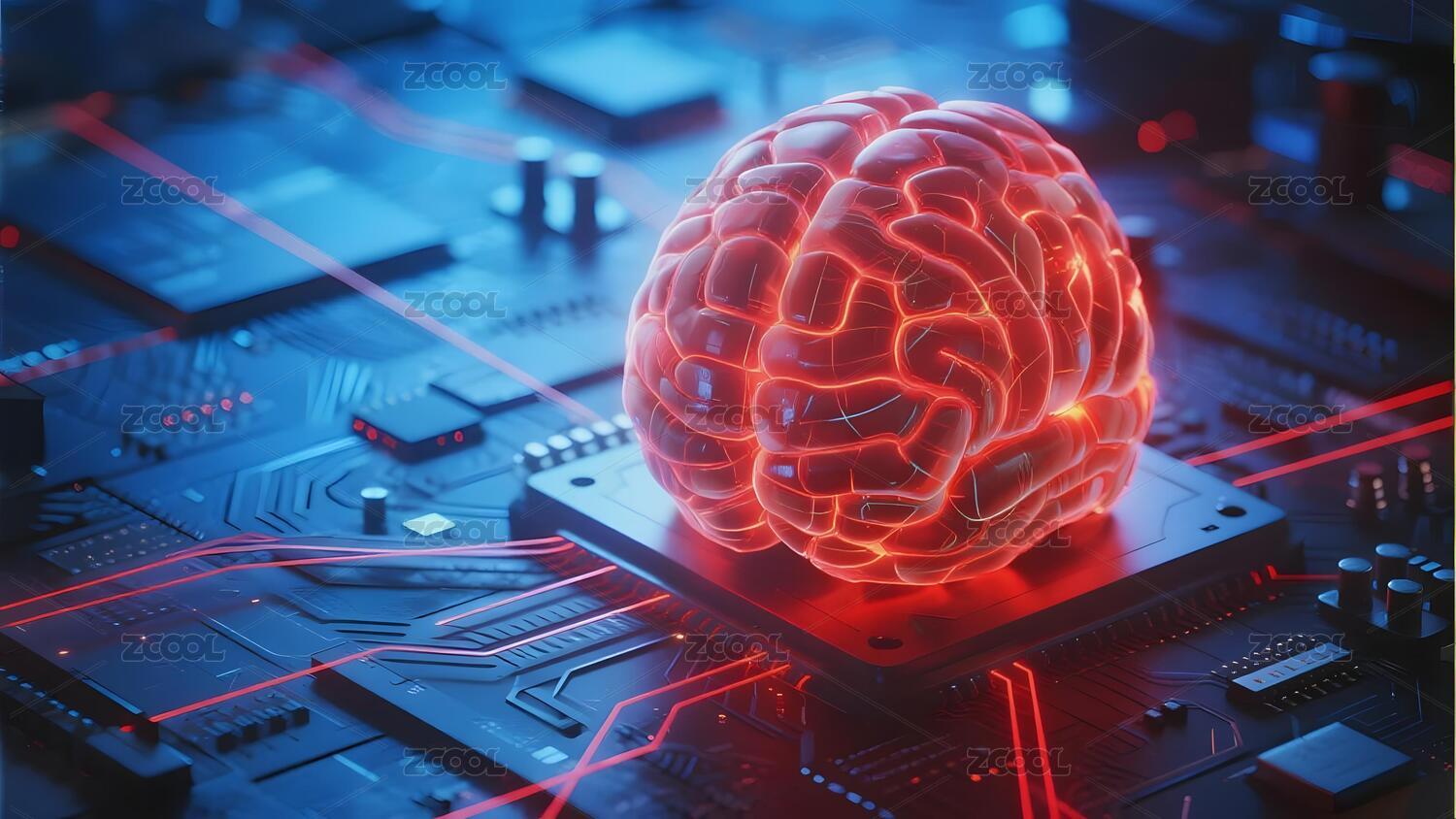 发光脑模型悬浮于电路板