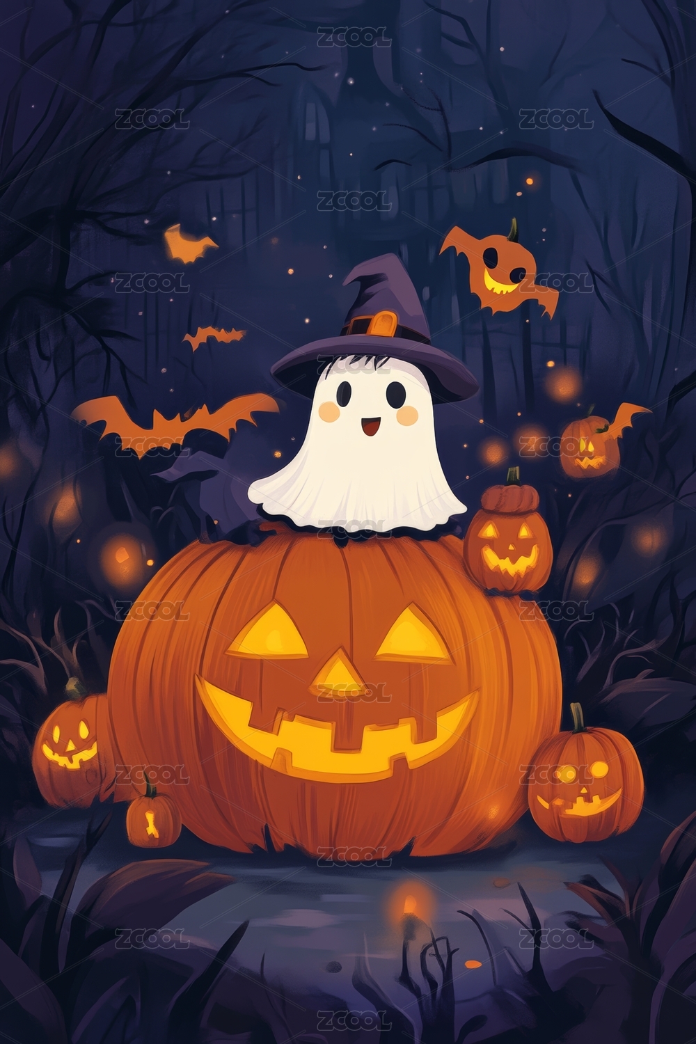 万圣节,幽灵,鬼魂,南瓜,巫师帽,夜晚,蝙蝠,星星,节日,插画