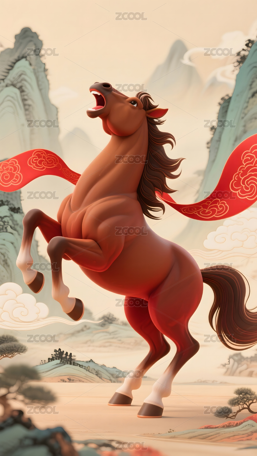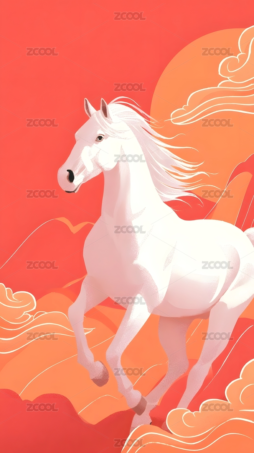 马,动物,马年,插画,奔跑,飞奔,山水,中国风,复古,鬃毛