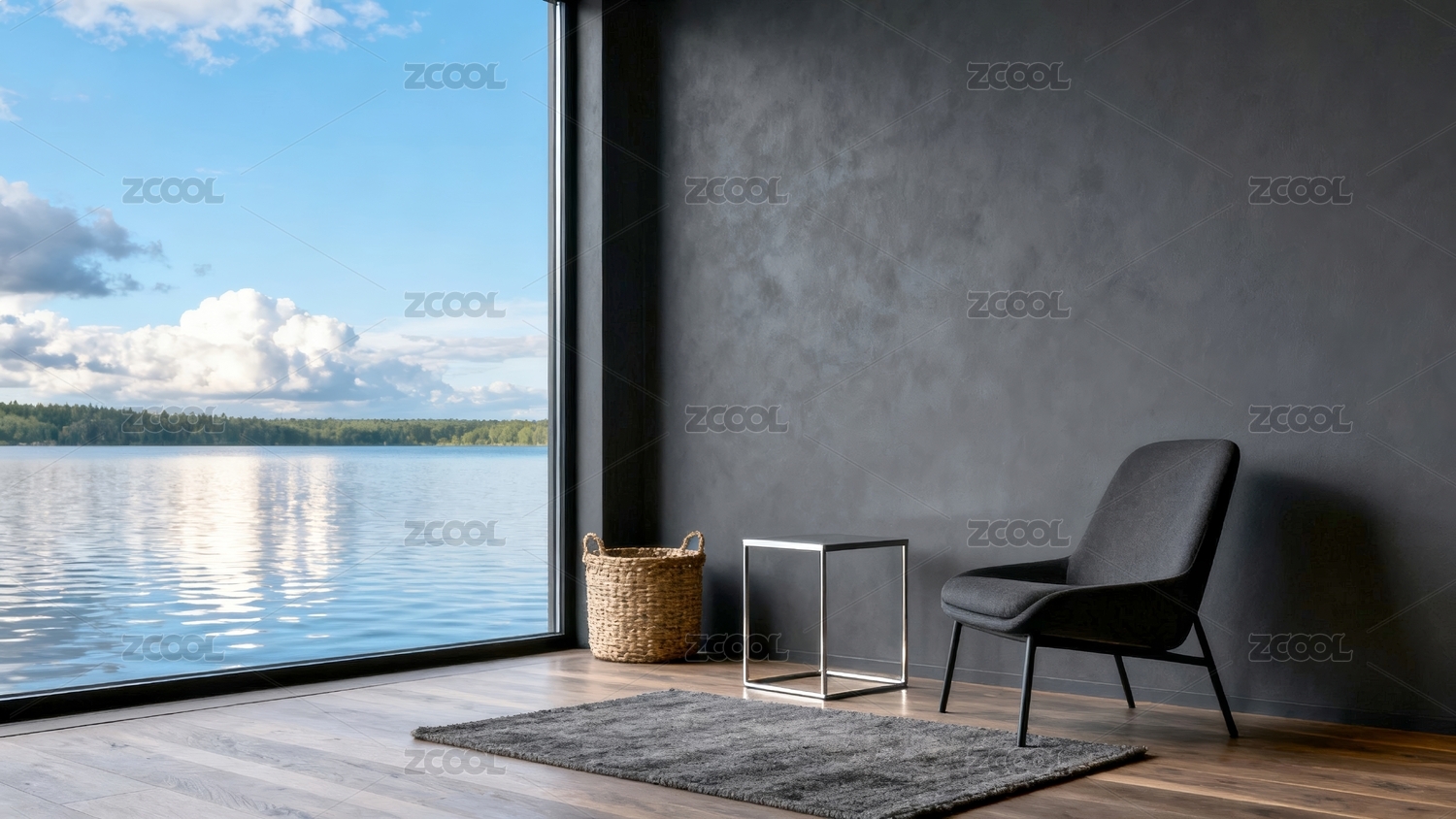 现代简约客厅拥有大面积落地窗可欣赏湖景