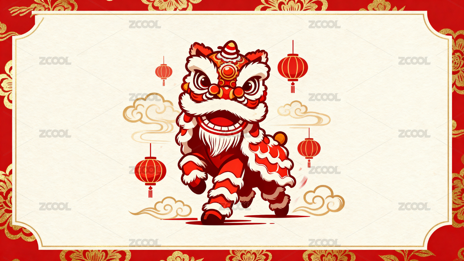 红色背景舞狮灯笼装饰图案