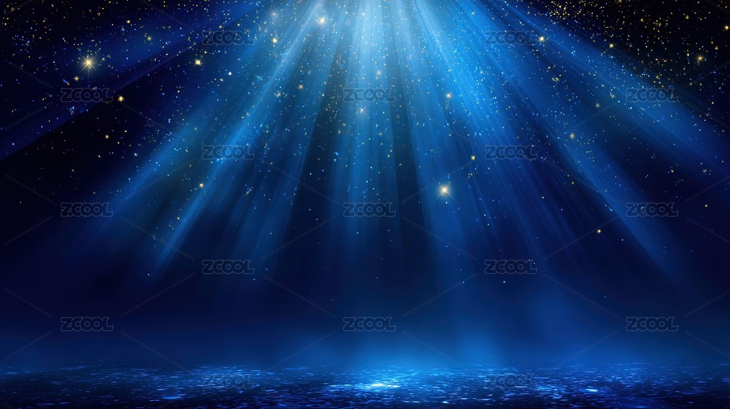 蓝色光束洒在木质舞台与星空背景