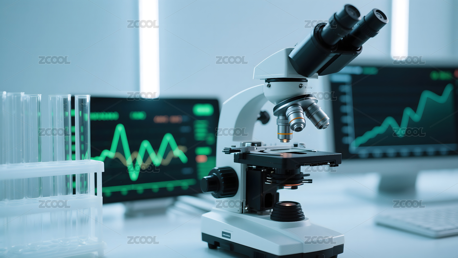实验室显微镜与数据屏幕展示