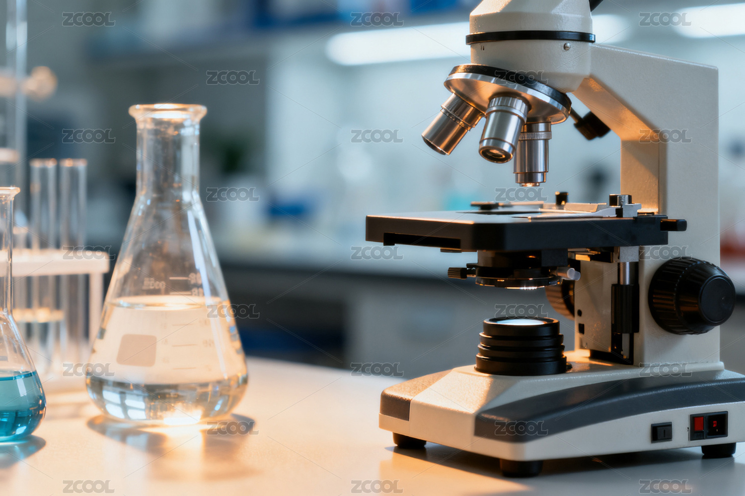 实验室显微镜与化学烧瓶