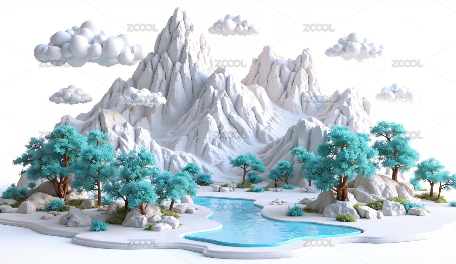 奇幻夏天悬浮山山顶绿树3D卡通插画模型
